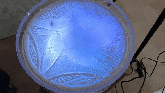 ○ 这是一种具有社交属性的“新家具”。一个小茶几,里面有一颗钢珠在沙盘上游走,画出各种图案。
