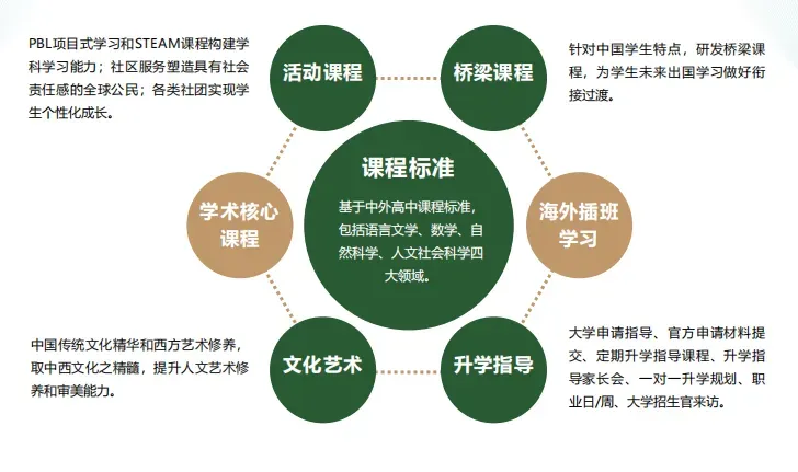 同时开设有AP课程和A-Level课程,满足绝大部分学生和家庭的留学目的地需求,如英、美、加、澳,以及新加坡、香港等。同时还开设德语、法语等二外课程,可申请欧洲国家的顶尖大学。