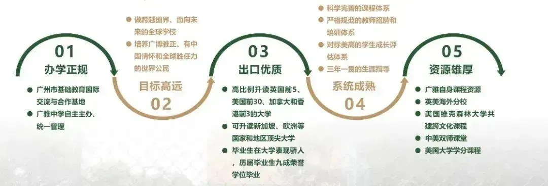 广东广雅中学历经134年文化浸润,是广州市“基础教育国际交流和合作实验基地”和广州市首批“教育国际化窗口学校培育创建单位”。广雅中学于2013年开办国际课程,对接英美顶级学校(含IB学校),互为“海外分校”, 开展中外合作办学,共享优质教学资源,构建全球学校联盟,培养兼具民族情怀、国际视野和国际竞争力的未来人才。