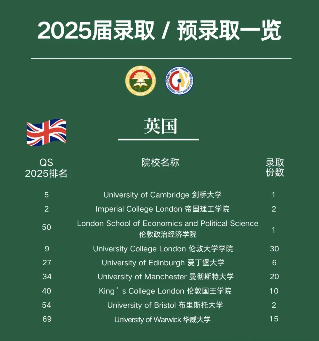 251份录取中,英国方向共收获104份,其中包括剑桥大学1份、帝国理工学院2份、伦敦政治经济学院(LSE)1份、伦敦大学学院(UCL)30份,G5的录取率达85.2%。与此同时,英国方向的毕业生连续第5年实现100%被英国前10大学录取的优异成绩。
