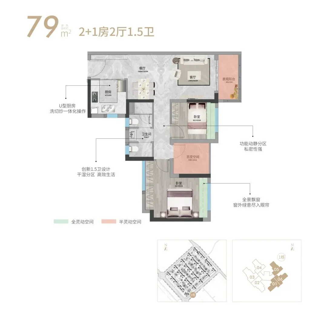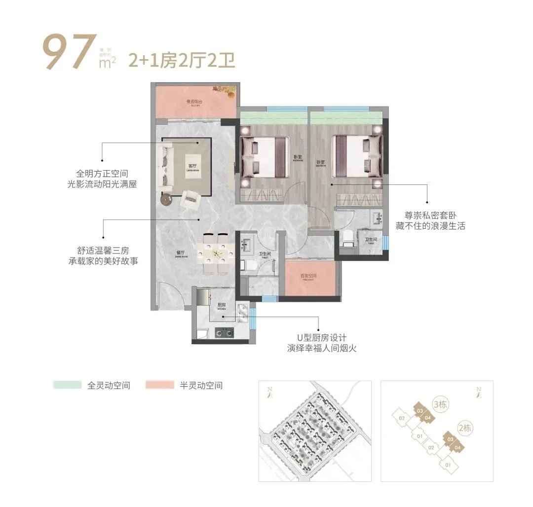全明方正竖向双厅,U型厨房更多储藏空间,私享套卧浪漫生活