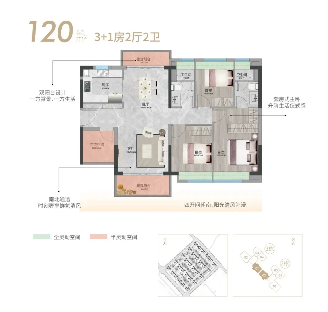 双阳台+阔绰双厅南北通透,四开间朝南,套房式主卧更多生活仪式感