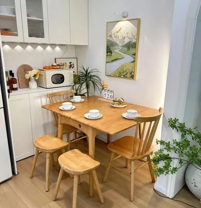房间再小 , 她也硬是挤出个用餐区 , 在角落里。