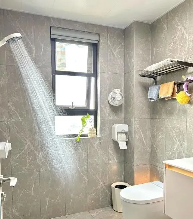 她还选了镜面瓷砖 , 光线一反射 , 视觉上宽敞很多 , 一点不憋屈。