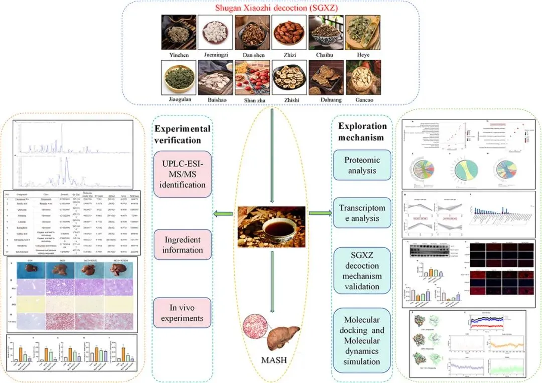 方法:采用超高效液相色谱-电喷雾离子化质谱(UPLC-ESI-MS)方法鉴定SGXZ汤的主要成分。通过过碘酸-雪夫反应(PAS)、苦味酸天狼星红(PSR)及油红O染色评估SGXZ汤对MCD诱导的MASH小鼠模型的治疗效果。采用多组学分析SGXZ汤对MASH的作用机制。通过TUNEL染色、Western blot(WB)、免疫组化(IHC)试剂盒、透射电子显微镜(TEM)及免疫荧光(IF)技术验证SGXZ汤对MASH的作用机制。最后,通过分子对接和分子动力学模拟验证了SGXZ汤关键成分与干预重要靶点的靶向性。