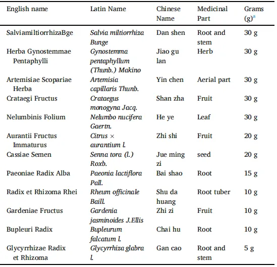 表1.SGXZ汤的英文名、拉丁名、中文名及药材克数。