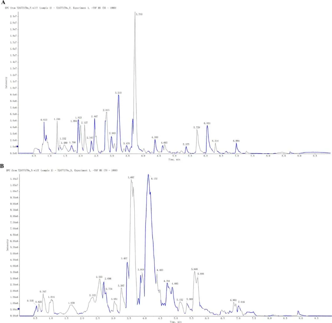图1.SGXZ汤在正负离子模式下采用UPLC-ESI-MS检测的总基峰色谱图(BPC)。(A) SGXZ汤在正离子模式下的色谱图。(B) SGXZ汤在负离子模式下的色谱图。