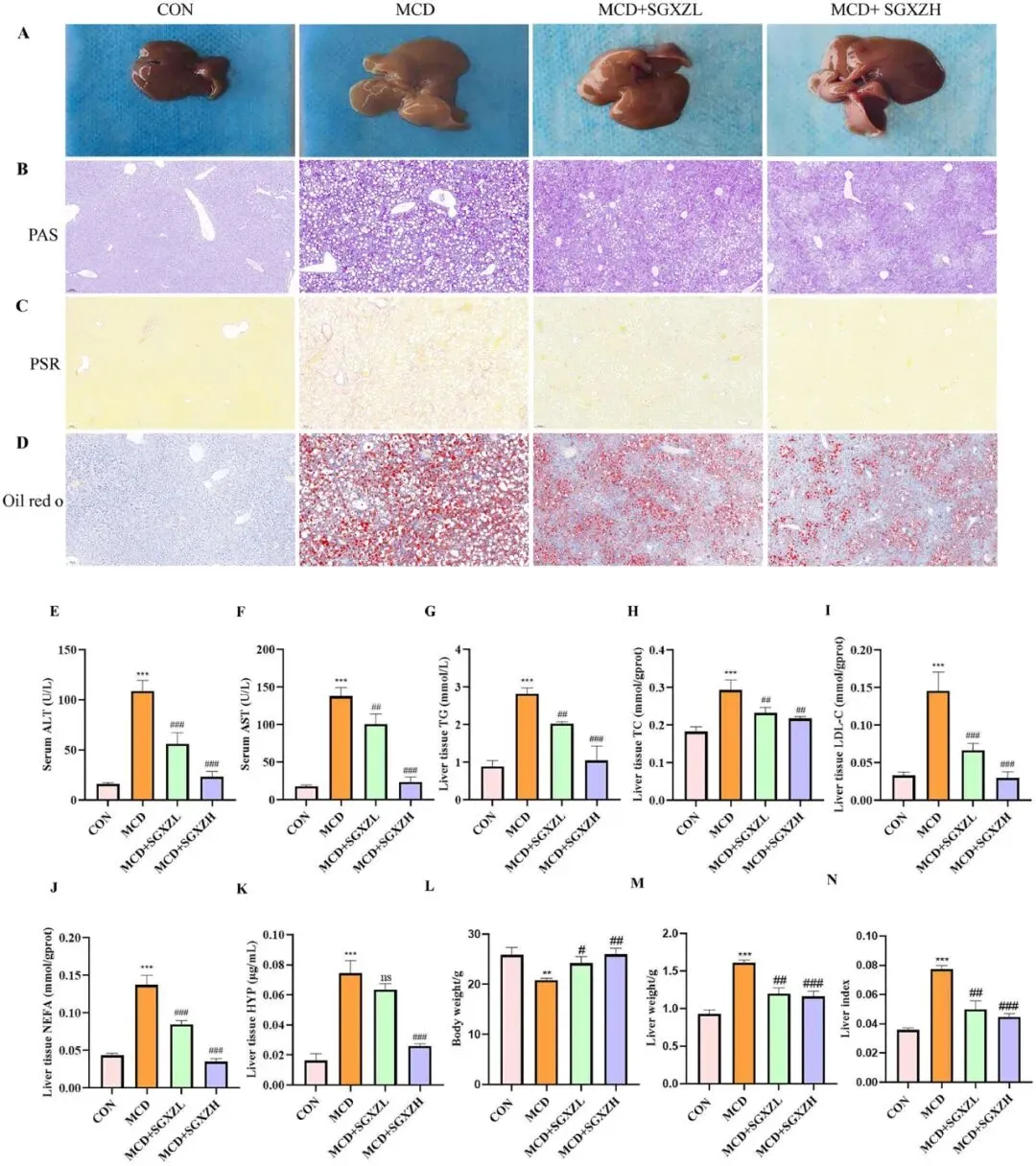 为了探讨SGXZ汤对MASH的治疗效果,研究人员通过MCD饮食诱导小鼠MASH模型,并随后用SGXZ汤进行治疗。根据肝脏的形态学特征,CON组的肝脏表面光滑,呈深红色,肝叶边缘锋利; 喂食MCD饮食6周后,与CON组相比,MCD组的肝脏体积增加,肝脏颜色变浅;然而,与MCD组相比,SGXZ汤各剂量组的肝脏颜色略微发红,且各组的肝脏形态得到改善(图2A)。与正常饮食组小鼠相比,MCD喂养小鼠的肝脏出现了典型的MASH病理特征,如广泛的脂肪变性、肝细胞肿胀改变、炎症细胞浸润(图2B)、肝纤维化(图2C)、肝脂质蓄积(图2D),但SGXZ汤改善了这些病理改变。为确定SGXZ汤对MCD诱导的肝损伤的保护作用,研究人员测定了ALT和AST水平。如图2E、F所示,与CON组相比,MCD组的ALT和AST水平显著升高(p<0.001)。然而,SGXZ汤干预后,AST和ALT水平显著降低(p<0.01)。此外,为进一步探索SGXZ汤对MCD诱导的肝脂质蓄积和纤维化的治疗效果,研究人员检测了肝组织中TG、TC、LDL-C、NEFA和HYP的水平。同样,SGXZ汤治疗抑制了MCD在MASH小鼠中诱导的这些指标的上调(p<0.001)(图2G-K)。此外,SGXZ 汤治疗降低了MCD 诱导的 MASH 小鼠的体重、肝脏重量和肝脏指数水平(p<0.01)(图 2l-N)。综上所述,研究者得出结论,SGXZ 汤改善了MCD 诱导的小鼠 MASH。