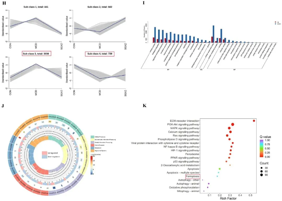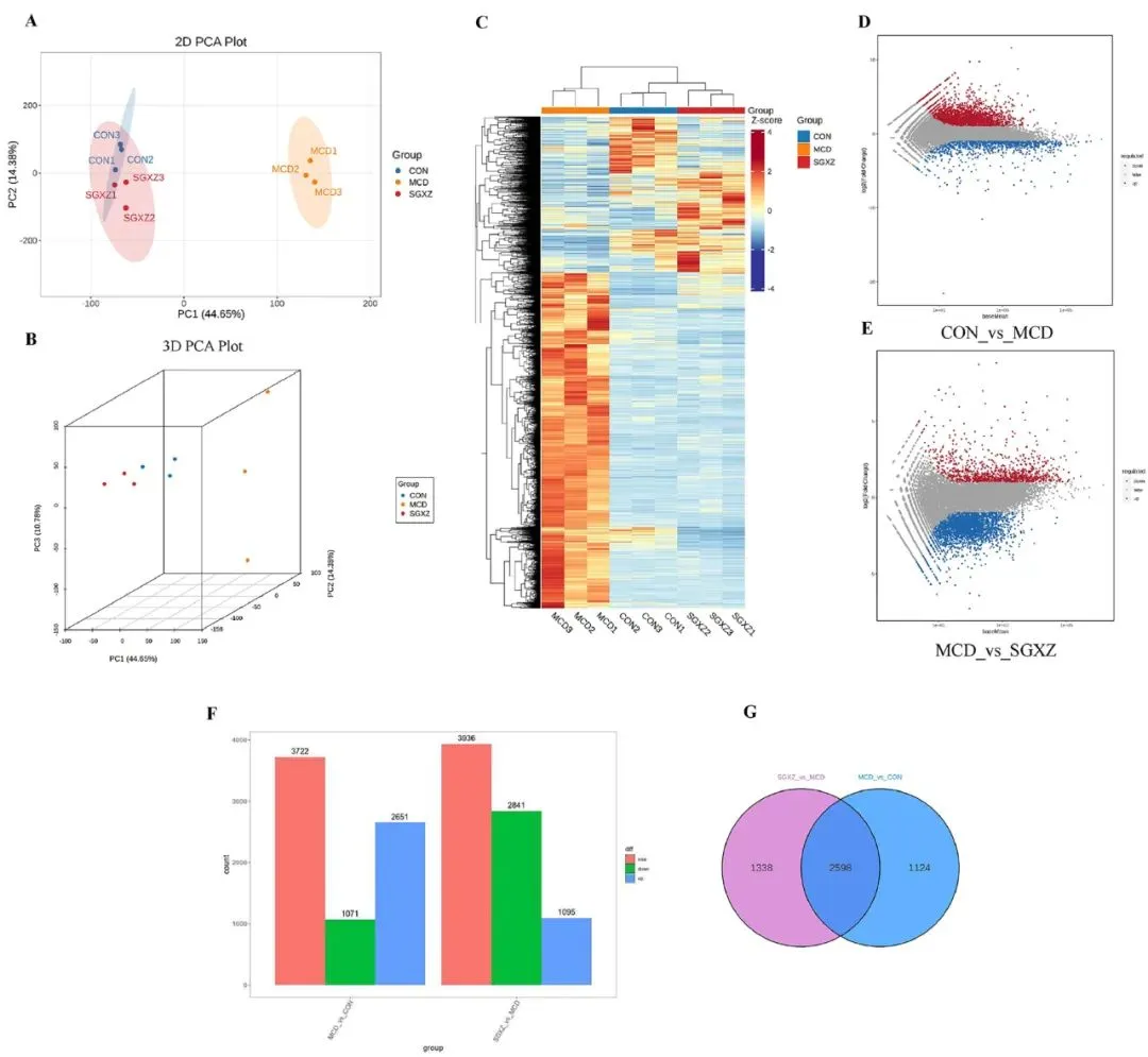 图4.SGXZ汤干预MCD诱导-MASH的转录组分析。(A-B)各组二维和三维PCA分布趋势图。(C)全基因热力图。(D-E)对照组、模型组与SGXZ汤组差异基因的MA图谱。(F)差异基因统计图谱。(G)对照组、模型组与SGXZ汤组差异基因维恩图。(H)差异表达基因K均值聚类图。(I)MCD组与SGXZ汤组差异基因的GO富集分析。(J)MCD组与SGXZ汤组KEGG富集环图。(K)MCD组与SGXZ汤组差异表达基因的KEGG富集分析。