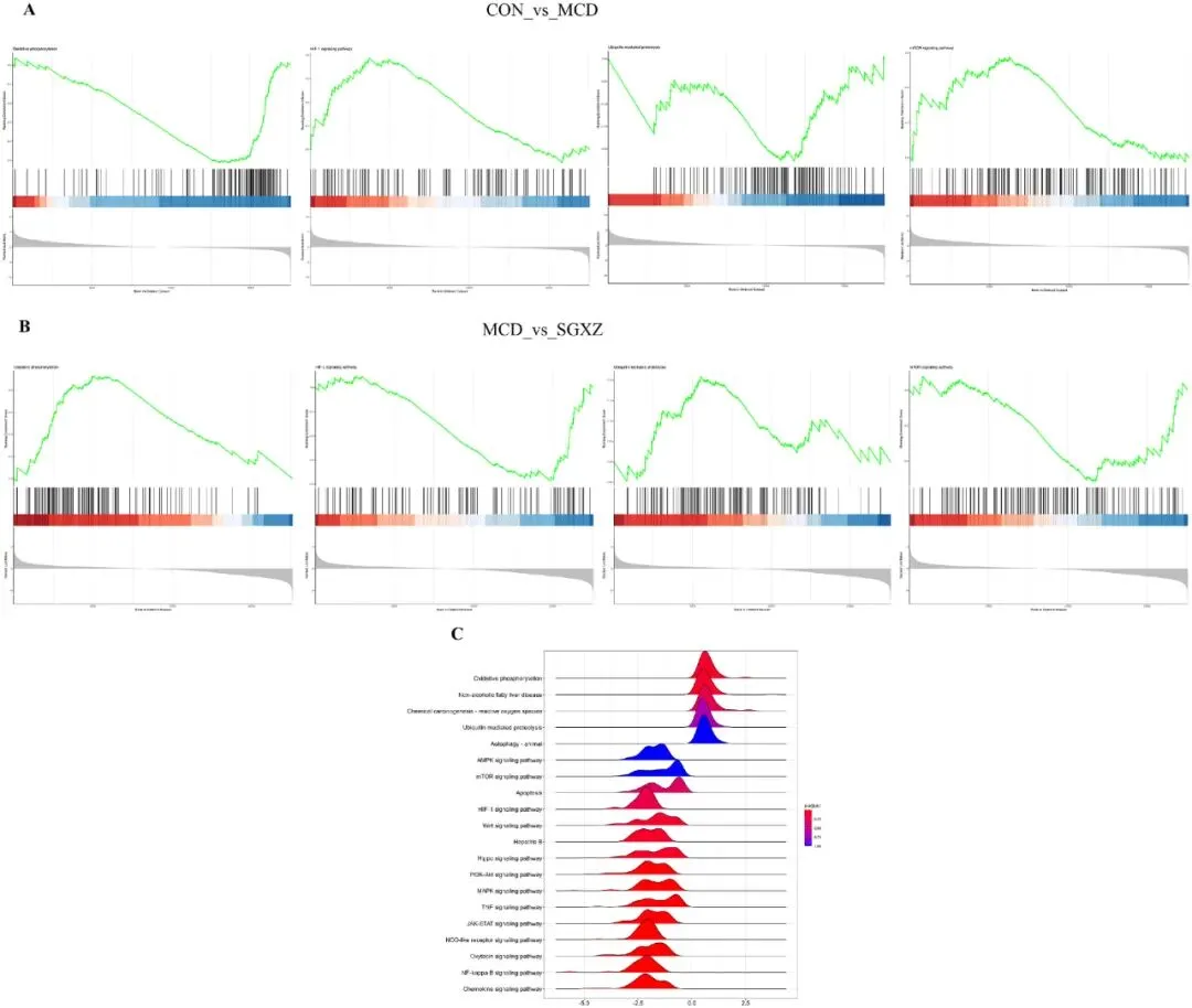 图5.基于SGXZ汤干预MCD诱导-MASH的转录组学的GSEA富集分析。(A-B)对照组、MCD组和SGXZ汤组的KEGG数据库GESA富集通路图谱。(C)MCD组和SGXZ汤组的KEGG数据库GESA富集脊线图谱。