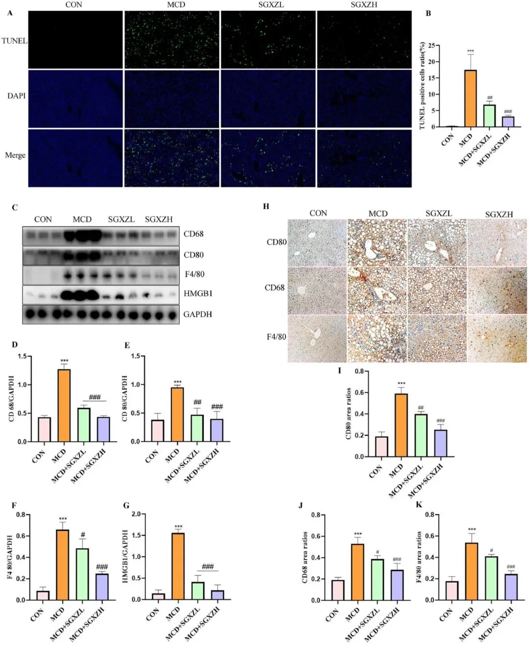 图6. SGXZ汤降低MCD诱导的MASH模型中肝细胞死亡及炎症反应。(A)TUNEL染色显示的肝细胞死亡代表性图像,比例尺= 200 μm。(B)各组肝细胞死亡数量统计。(C)肝脏CD68、CD80、F4/80及HMGB1蛋白的典型Western blot结果。(D-G)CD68、CD80、F4/80及HMGB1蛋白表达量的光密度分析(以GAPDH含量为内参)。(H)肝脏CD68、CD80和F4/80蛋白的免疫组化典型图像,比例尺= 50μm。(I-K)CD68、CD80和F4/80蛋白表达量的免疫组化定量分析。AOD=IOD/面积。***p<0.001(与对照组相比);#p<0.05;##p<0.01;###p<0.01(与MCD组相比,n=8)。