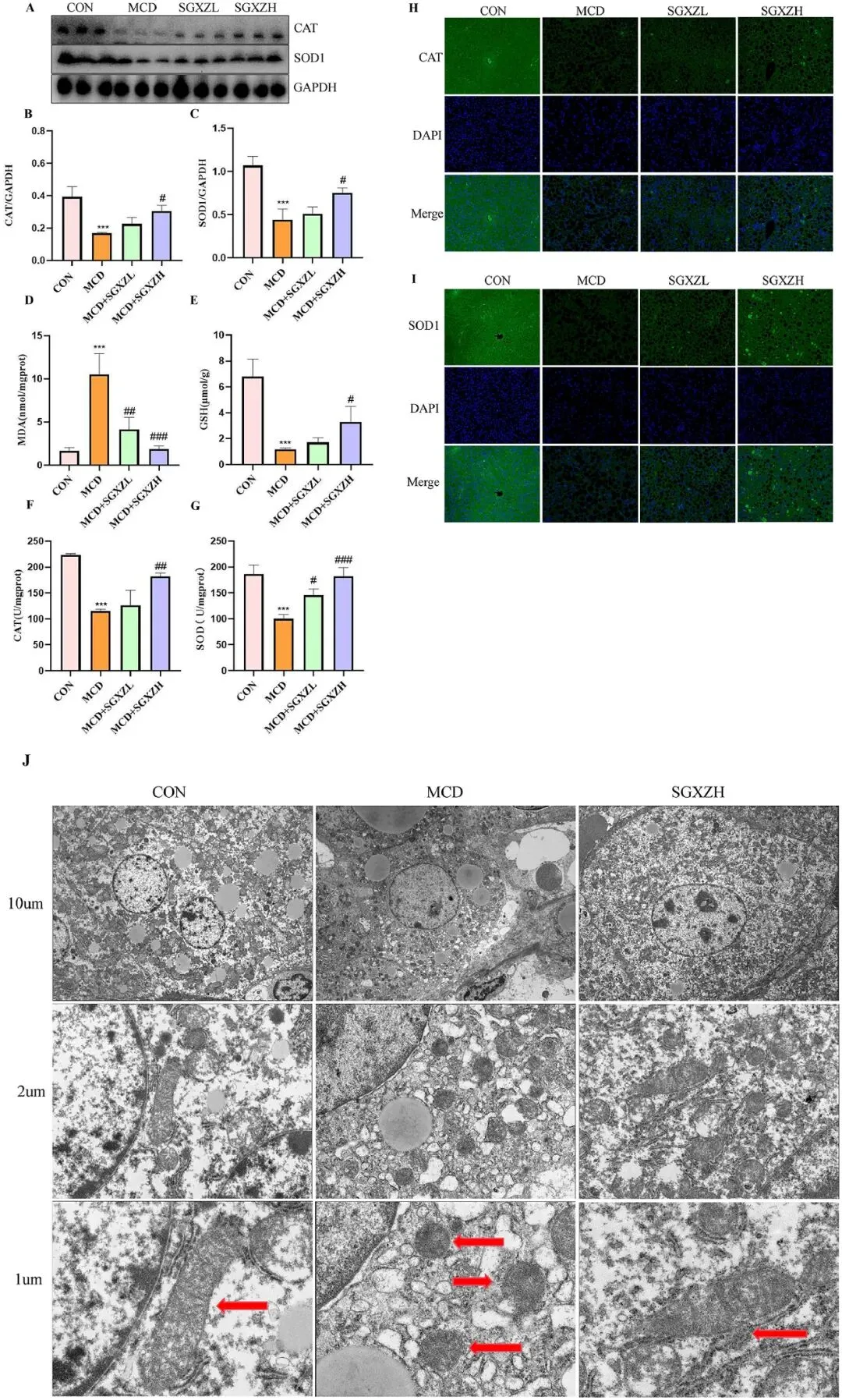 图7. SGXZ汤缓解MCD诱导的MASH模型中肝脏氧化应激并维持线粒体结构。(A)肝脏CAT和SOD1蛋白的代表性Western blot图像。(B-C)CAT和SOD1蛋白表达量与GAPDH含量标准化后的光密度分析结果。(D-G)各组间丙二醛(MDA)、超氧化物歧化酶(SOD)、谷胱甘肽(GSH)和CAT水平的柱状图。(H-I)肝脏CAT和SOD1蛋白的代表性免疫荧光图像。比例尺= 50 μm。(J)各组线粒体超微结构的代表性透射电镜图像。比例尺= 10 μm、2 μm、1 μm。***p<0.001 vs.对照组;#p<0.05,##p<0.01,###p<0.01 vs. MCD组(n = 8)。