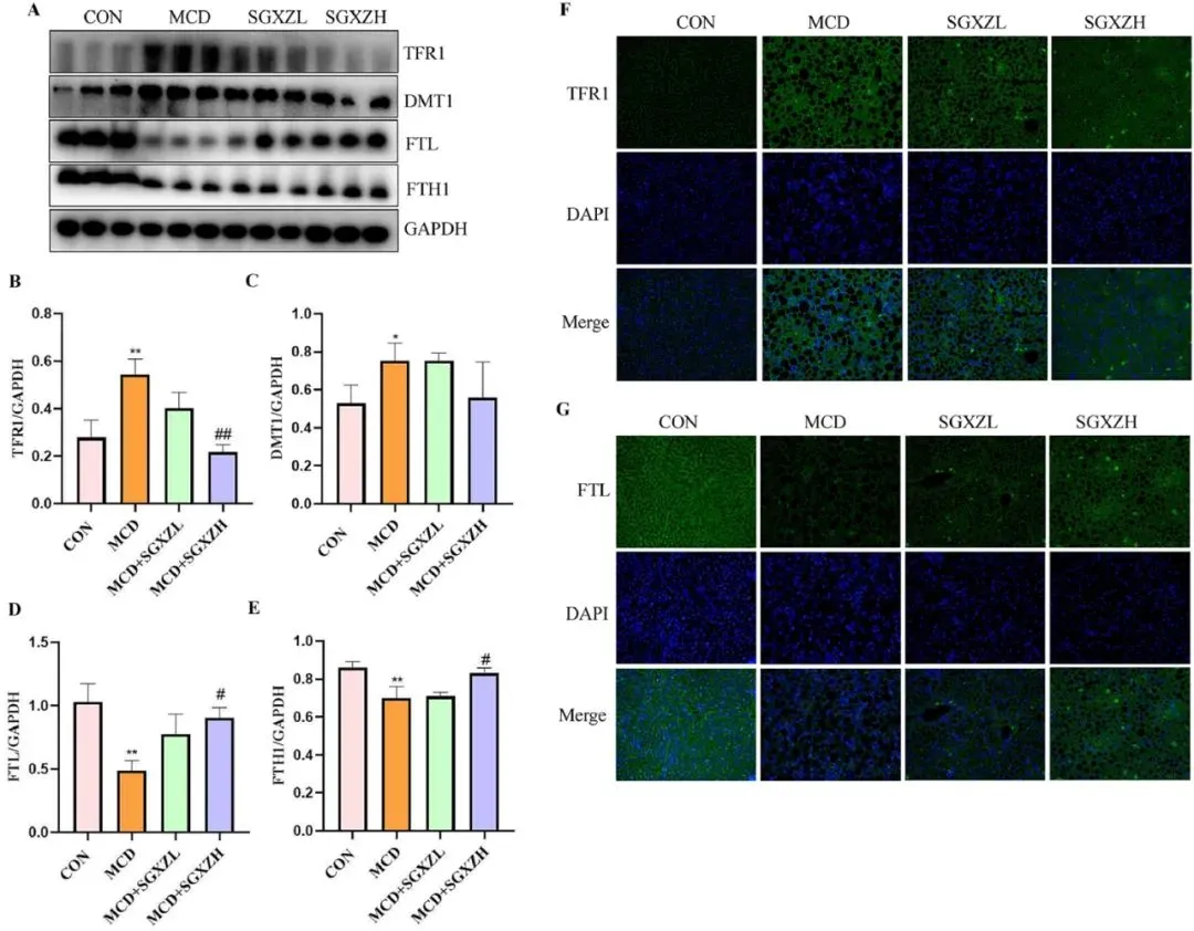 图8. SGXZ汤缓解MCD诱导的MASH模型中铁代谢失衡。(A)肝脏中TFR1、DMT1、FTL和FTH1蛋白的代表性Western blot图像。(B-E)以GAPDH含量为内参的TFR1、DMT1、FTL和FTH1蛋白表达量光密度分析结果。(F-G)肝脏中TFR1和FTL蛋白的代表性免疫荧光图像。比例尺= 50 μm。***p<0.001(与对照组相比);#p<0.05,##p<0.01,###p<0.01(与MCD组相比,n=8)。