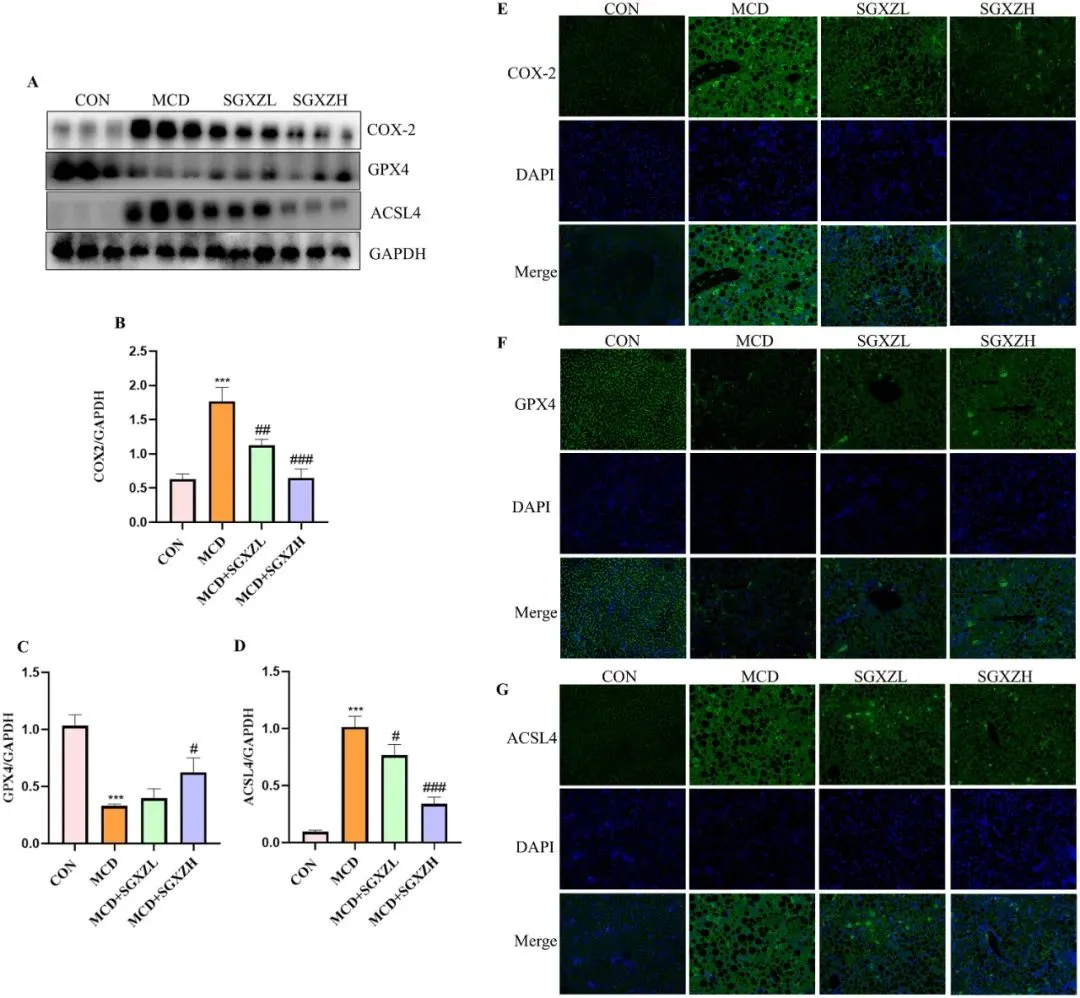 图9. SGXZ汤抑制MCD诱导的MASH模型脂质过氧化。(A)肝脏中COX2、GPX4和ACSL4蛋白的代表性Western blot图像。(B-D)以GAPDH含量为内参的COX2、GPX4和ACSL4蛋白表达量光密度分析结果。(E-G)肝脏中COX2、GPX4和ACSL4蛋白的代表性免疫荧光图像。比例尺= 50 μm。***p<0.001 vs.对照组;#p<0.05,##p<0.01,###p<0.001 vs. MCD组(n = 8)。