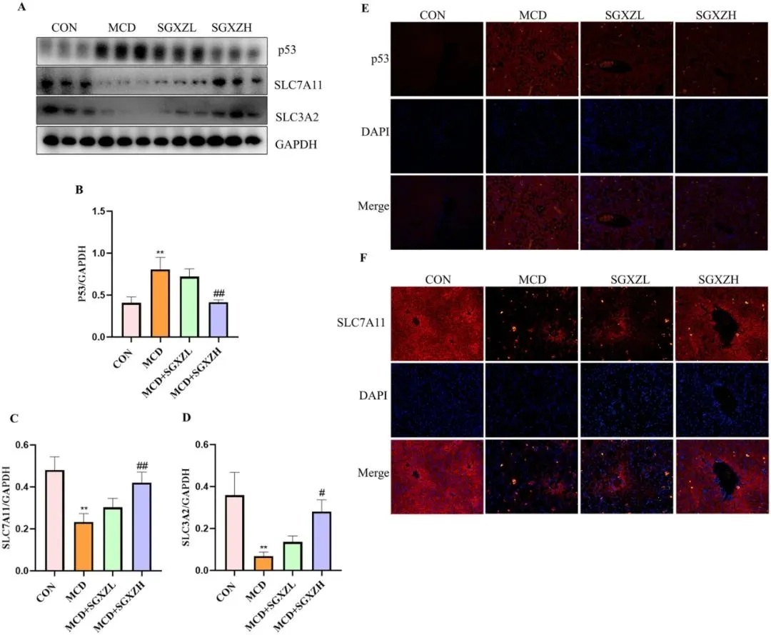 图10. SGXZ汤对MCD诱导的MASH模型中p53及Xc-系统表达的影响。(A)肝脏中p53、SLC7A11和SLC3A2蛋白的代表性Western blot图像。(B-D)经GAPDH含量标准化后的p53、SLC7A11和SLC3A2蛋白表达量光密度分析结果。(E-F)肝脏中p53和SLC7A11蛋白的代表性免疫荧光图像。比例尺= 50μm。**p<0.01 vs.对照组;#p<0.05,##p<0.01 vs. MCD组(n = 8)。