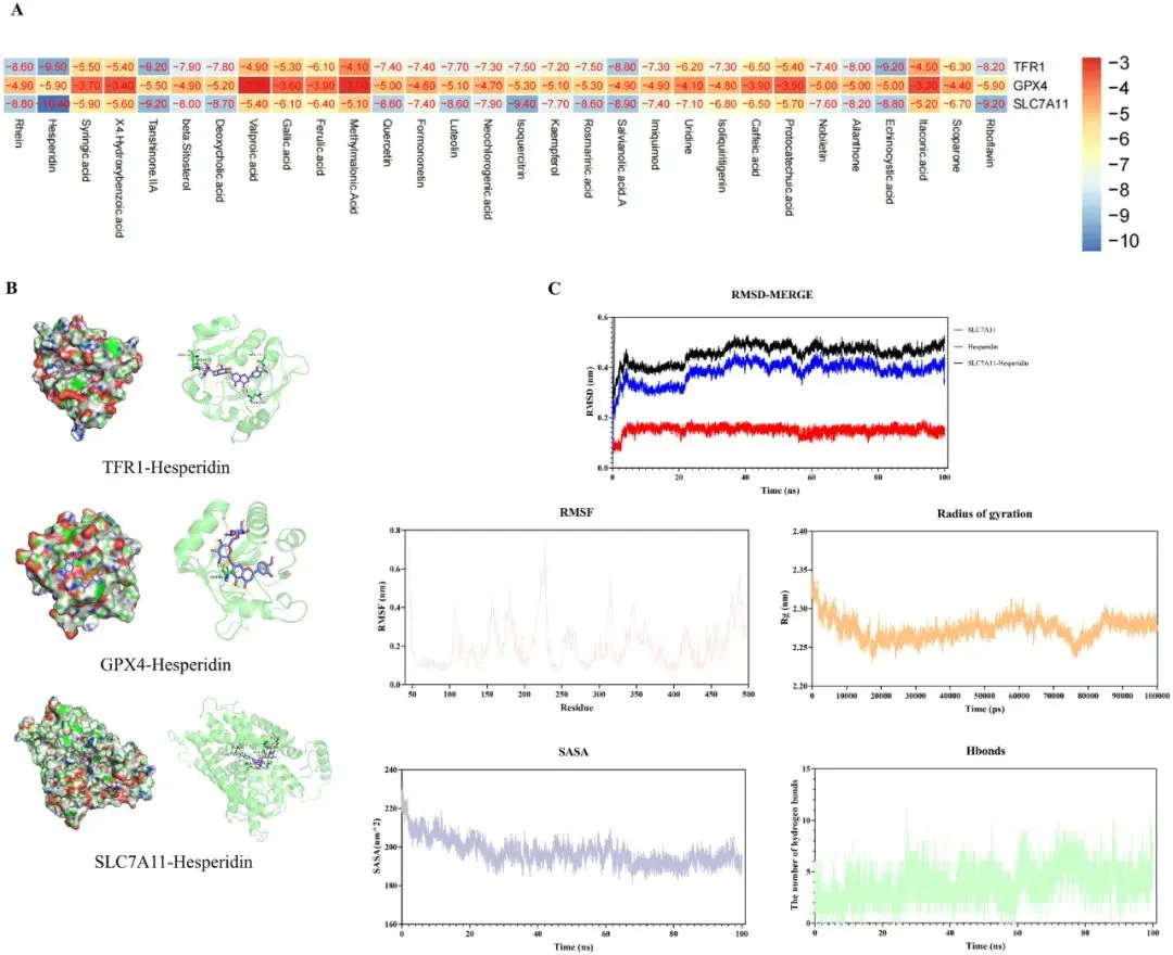 图11.分子对接与分子动力学模拟结果。(A)SGXZ汤中30种活性成分与关键靶点的对接得分热力图。(B)关键靶点与化合物的典型对接复合物示意图。(C)SLC7A11-橙皮苷复合物的分子动力学模拟分析,包含RMSD曲线、RMSF曲线、Rg曲线、SASA曲线及氢键分析。