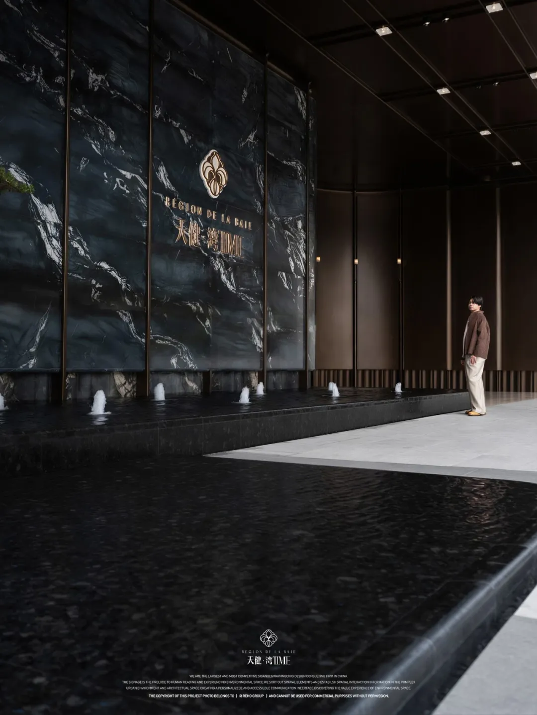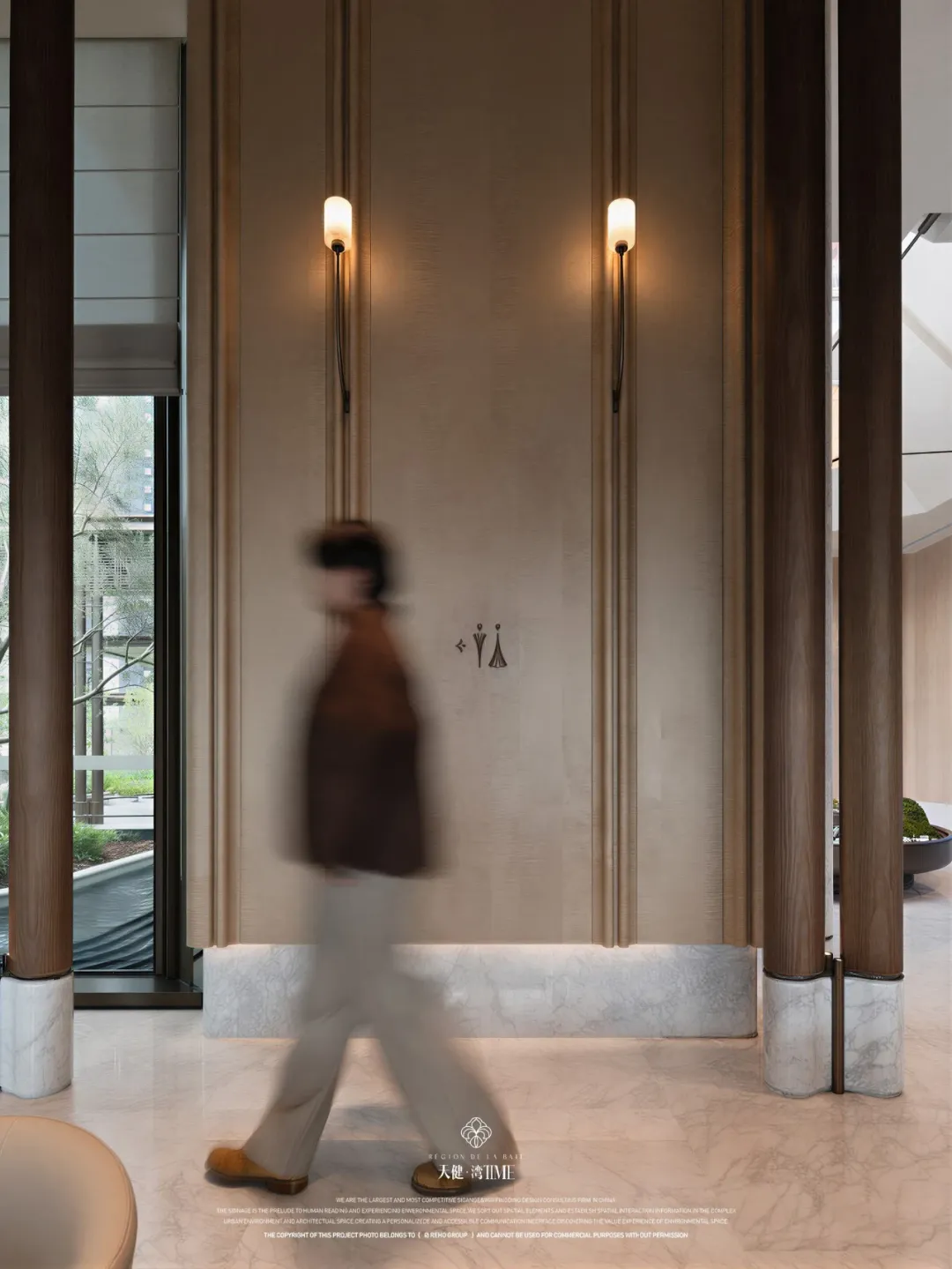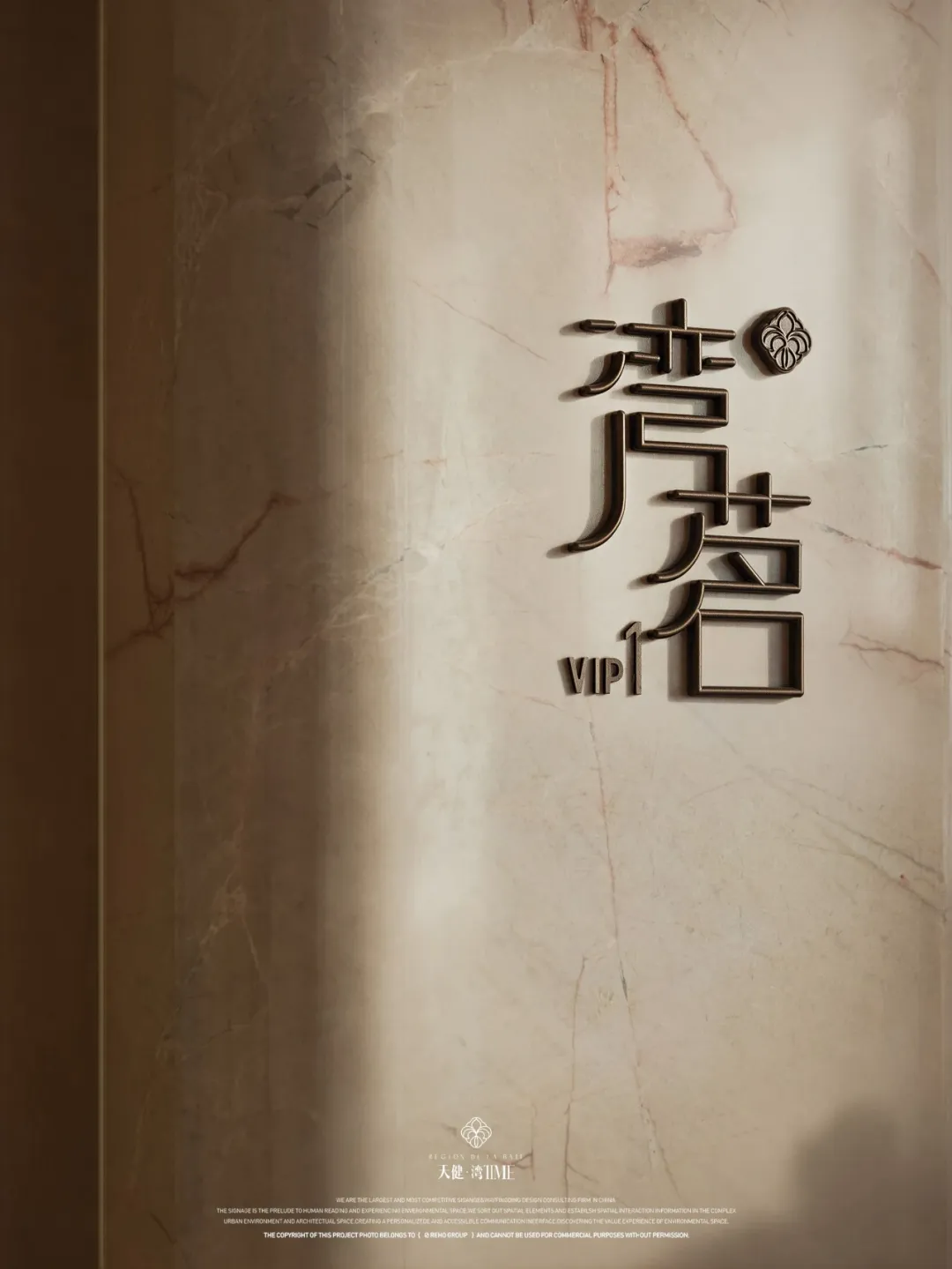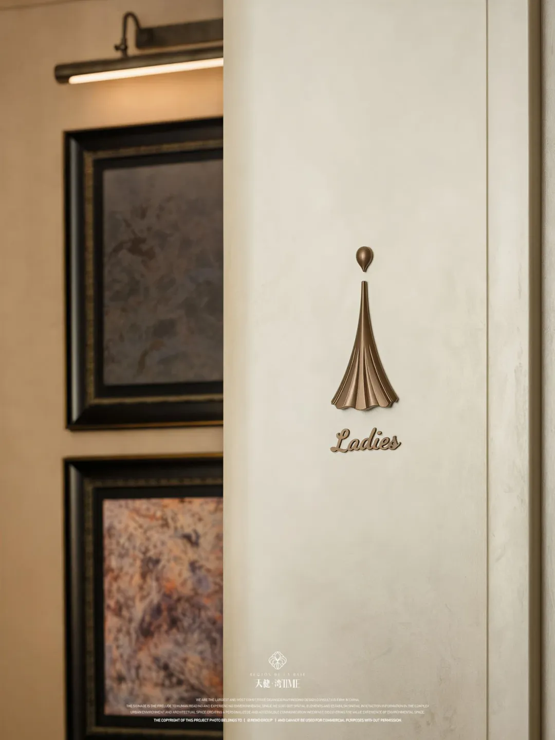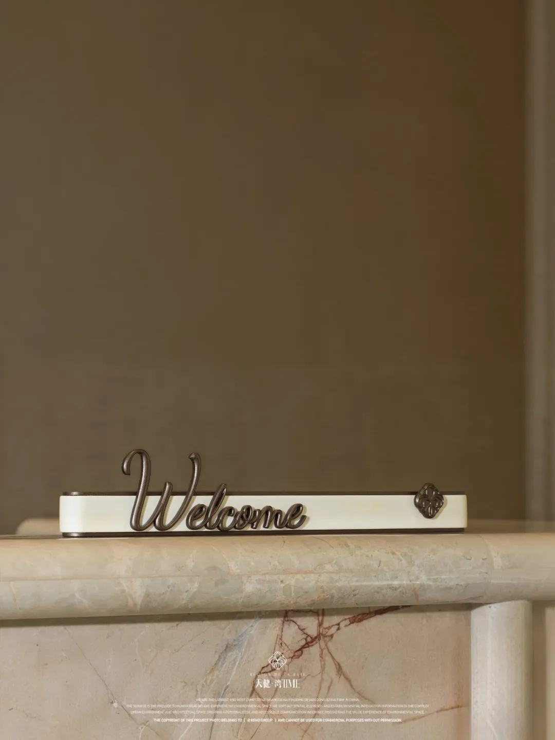 入口翡翠之门形象标识以珍稀范思哲绿石材为衬,采用米兰白玉透光云石,结合精工锤纹工艺。当背光缓缓亮起,光线穿透石材的温润质地,晕染出柔和而富有层次的光韵,宛如一件静静发光的艺术装置,迎接每一位归者。室内接待台畔,花体英文以一缕松弛笔意,书写抵达的浪漫序章。金属是恒久的,光线是流逝的。这种矛盾造就了深邃的戏剧性。当光线掠过大理石墙面,衬托出古铜色精工字的质感与轮廓,它仿佛在诉说:最闪耀的瞬间,生于最沉静的底色。