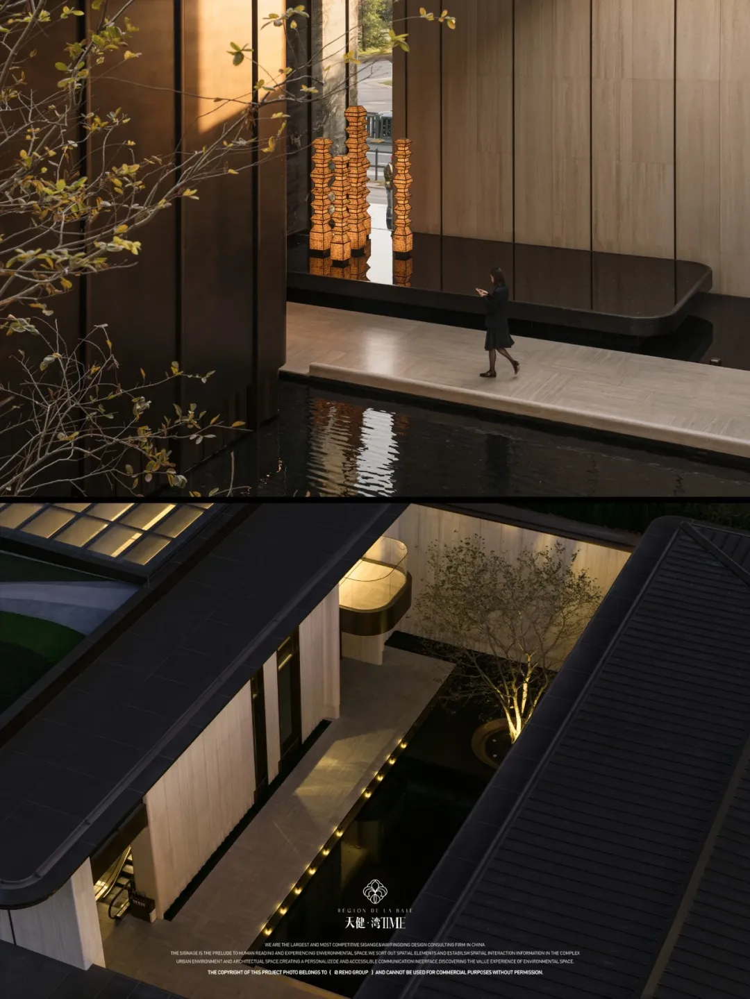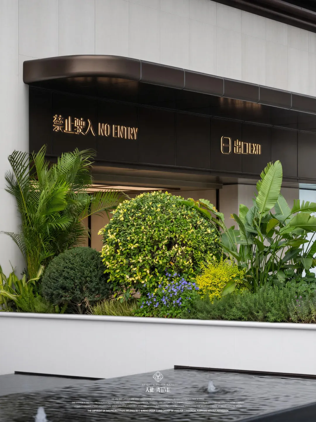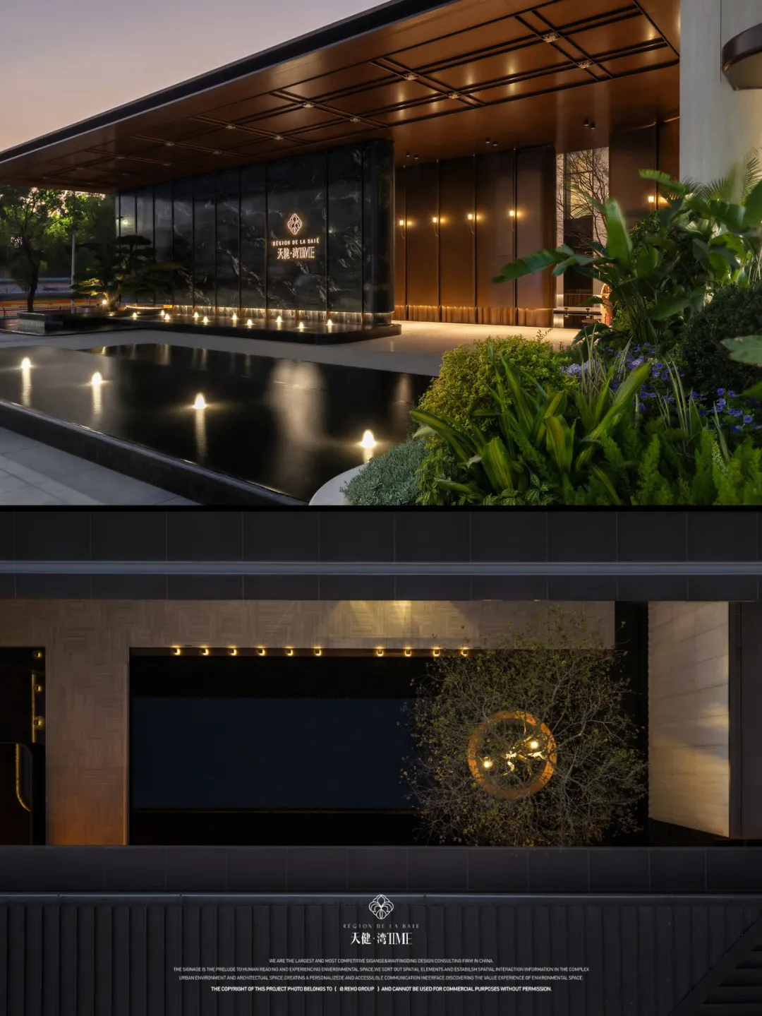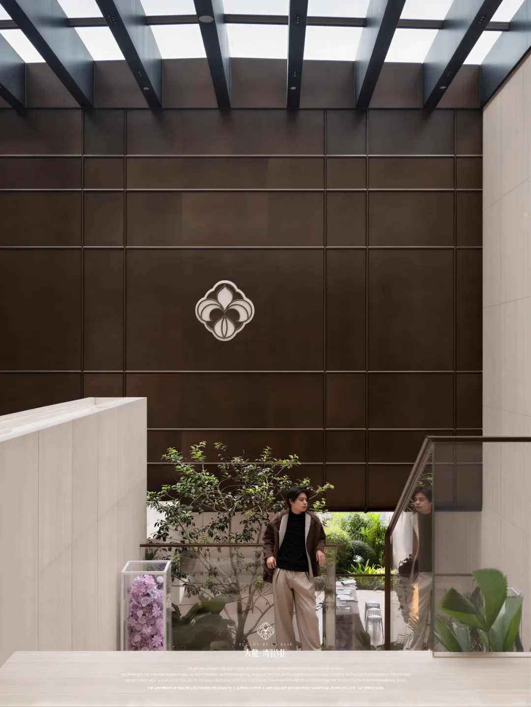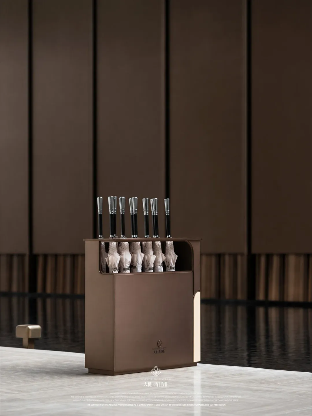 入口翡翠之门形象标识以珍稀范思哲绿石材为衬,采用米兰白玉透光云石,结合精工锤纹工艺。当背光缓缓亮起,光线穿透石材的温润质地,晕染出柔和而富有层次的光韵,宛如一件静静发光的艺术装置,迎接每一位归者。室内接待台畔,花体英文以一缕松弛笔意,书写抵达的浪漫序章。金属是恒久的,光线是流逝的。这种矛盾造就了深邃的戏剧性。当光线掠过大理石墙面,衬托出古铜色精工字的质感与轮廓,它仿佛在诉说:最闪耀的瞬间,生于最沉静的底色。