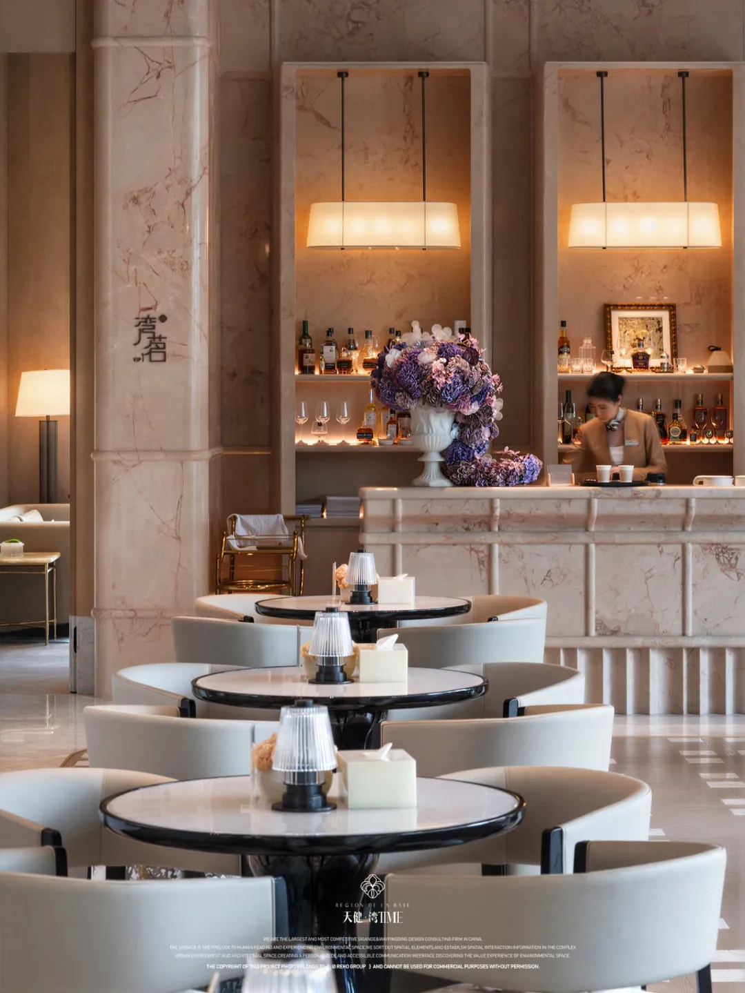 项目秉承“优雅演绎当代法式生活美学”的核心理念,打造承载社交娱乐、洽谈会客、休闲放松等百般场景的奢尚雅静景观会客厅。室内空间,浅色调大理石如静默画卷铺展,法式石膏线在其上勾画比例与节奏,赋予空间一种无形的秩序感和仪式般的宁静美好。