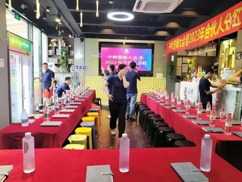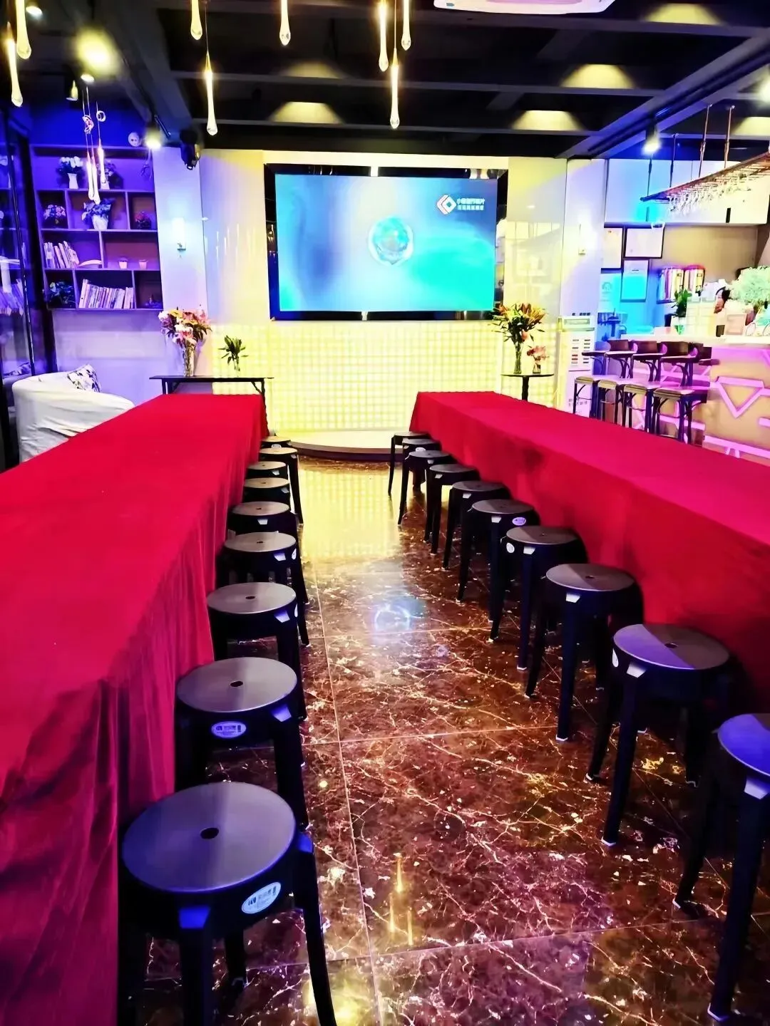 ▲50人会议场地布置,带小舞台,LED屏幕,环绕低音立体声响,支持手机电脑投屏