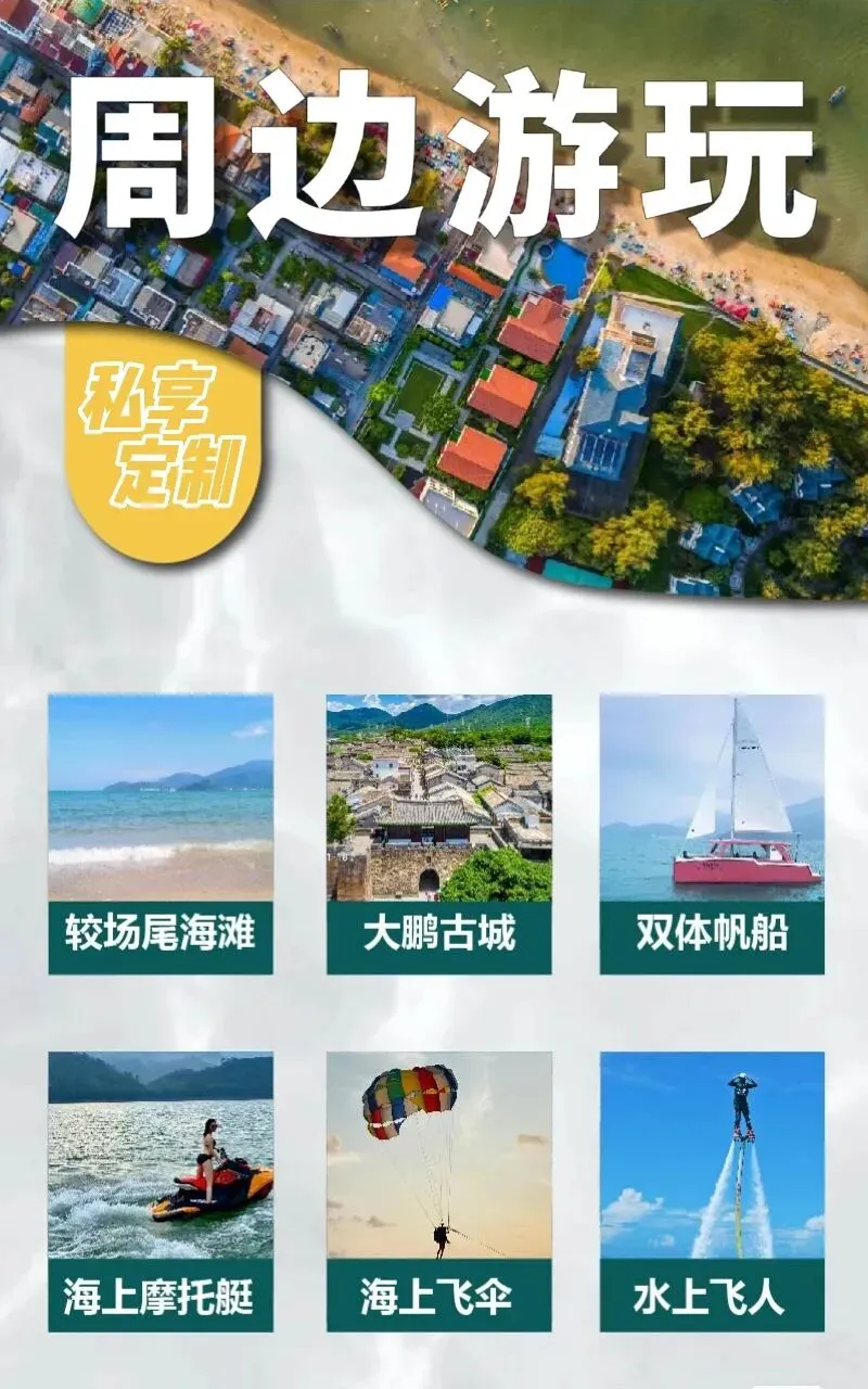 附近相关景点较场尾,大鹏古城,、美丽乡村、东山寺、七娘山、杨梅坑美人鱼拍摄基地,天文台和地质公园,金沙湾海滨公园都不收门票,可免费游玩。