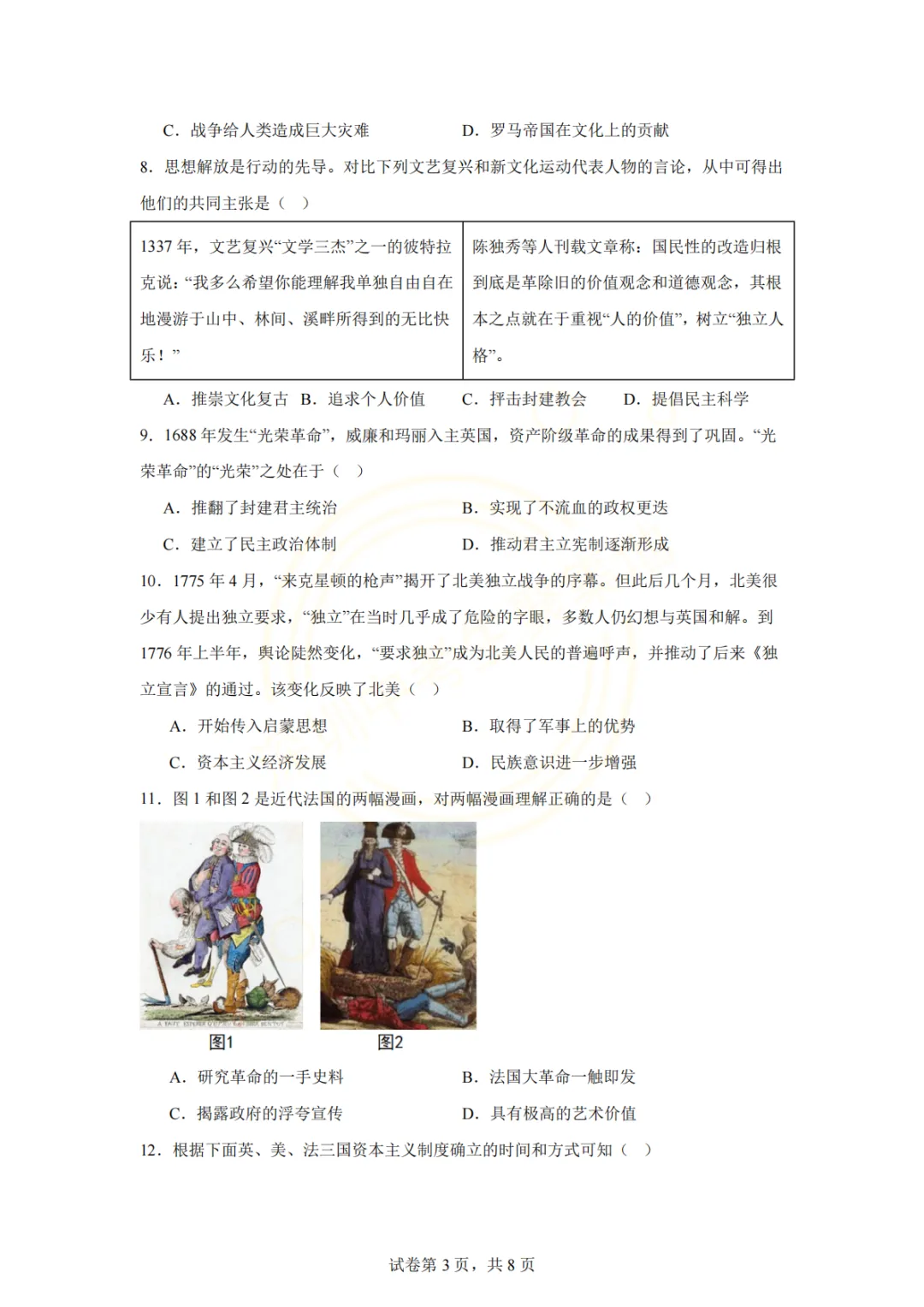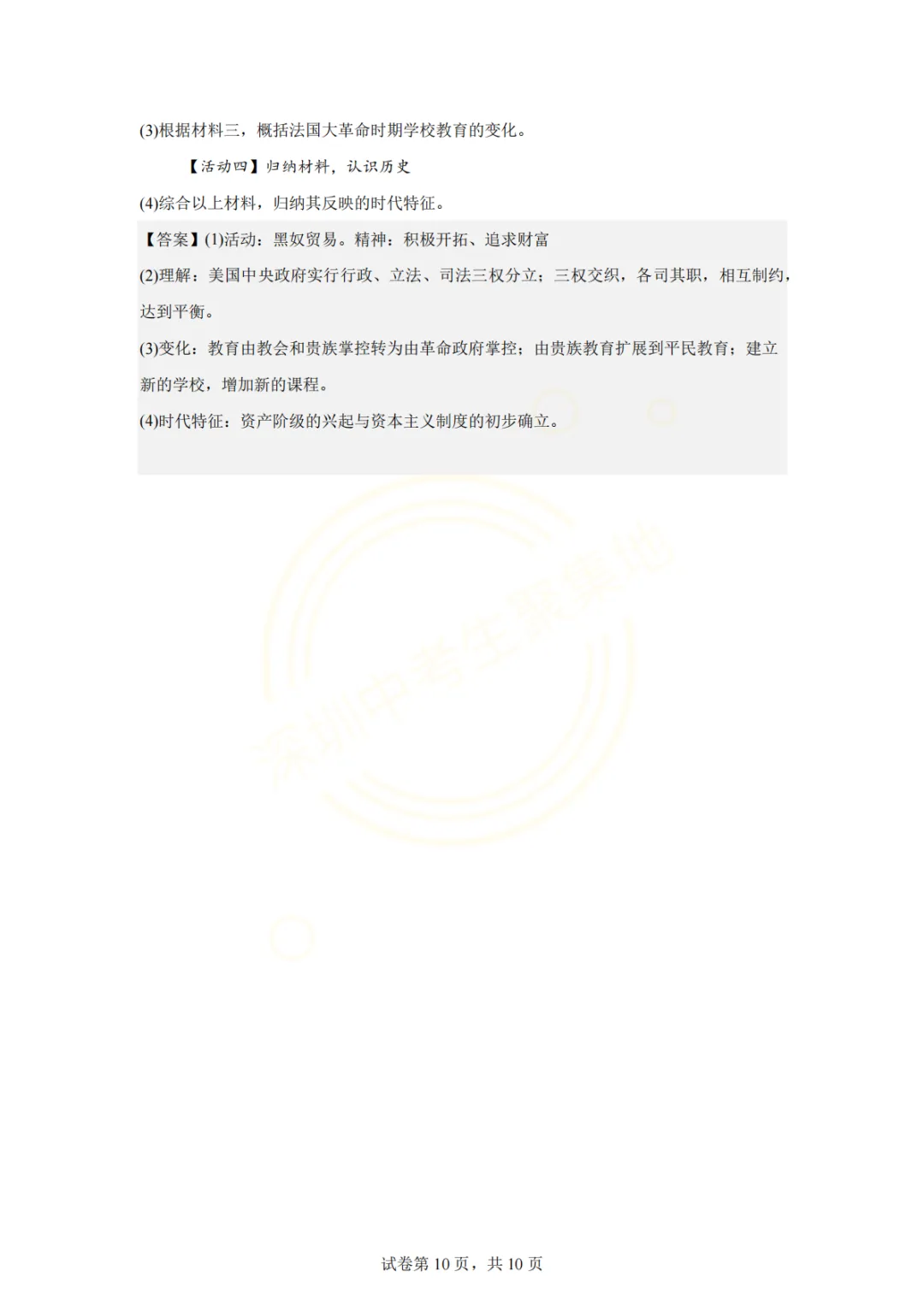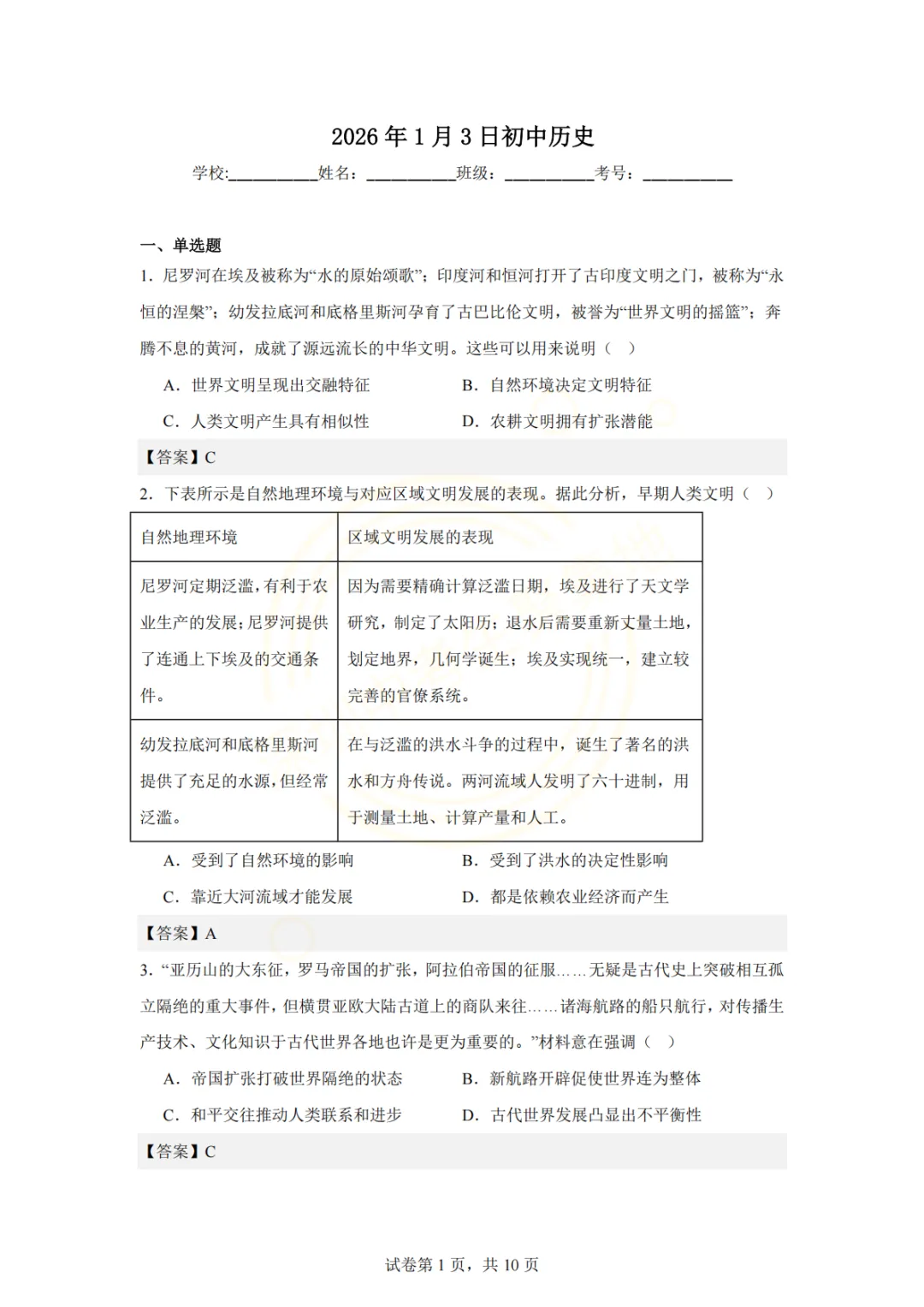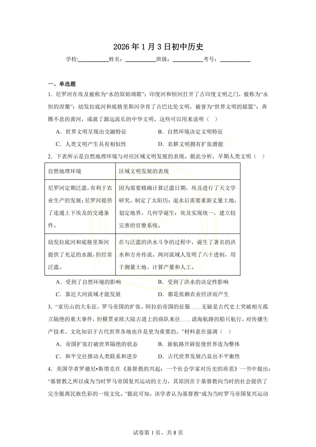 深圳市2026年历史试卷(一个初中学校的月考试题)