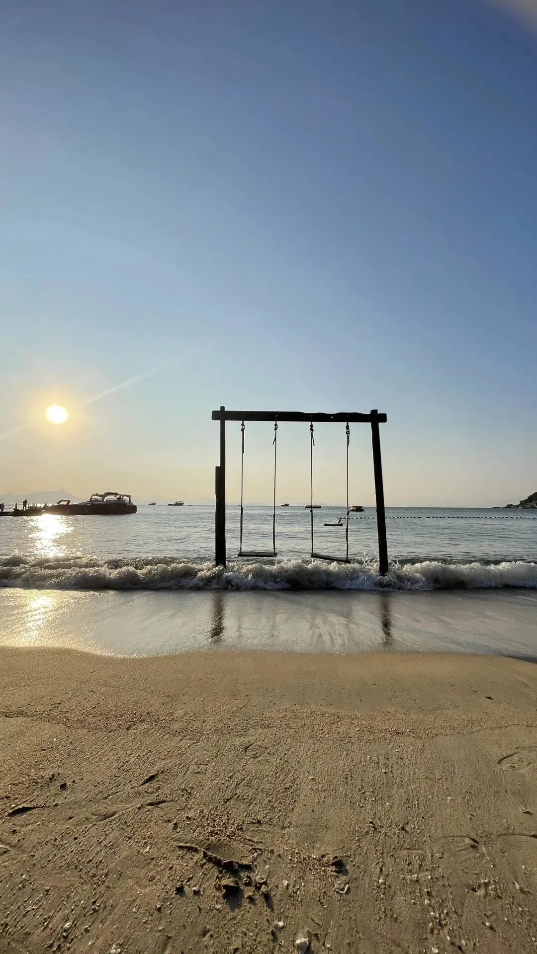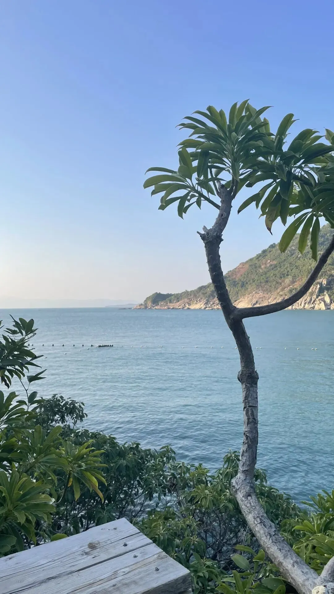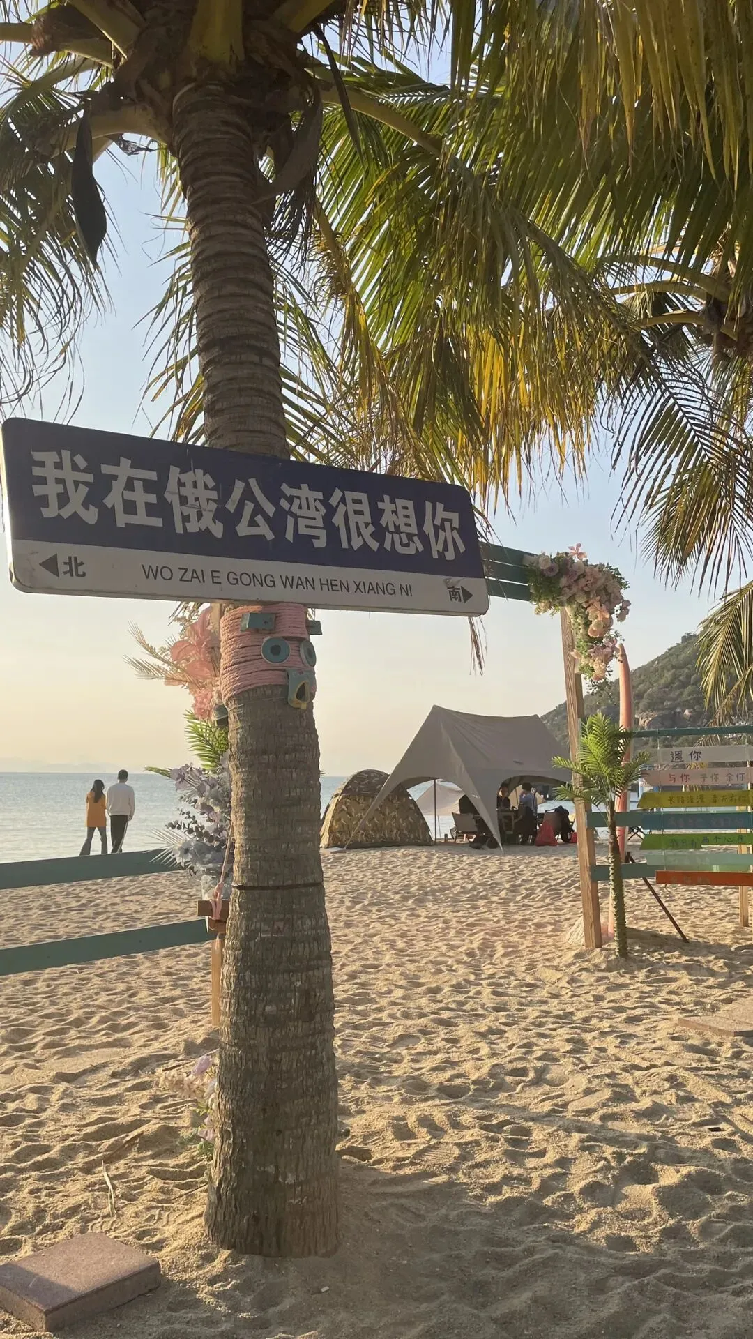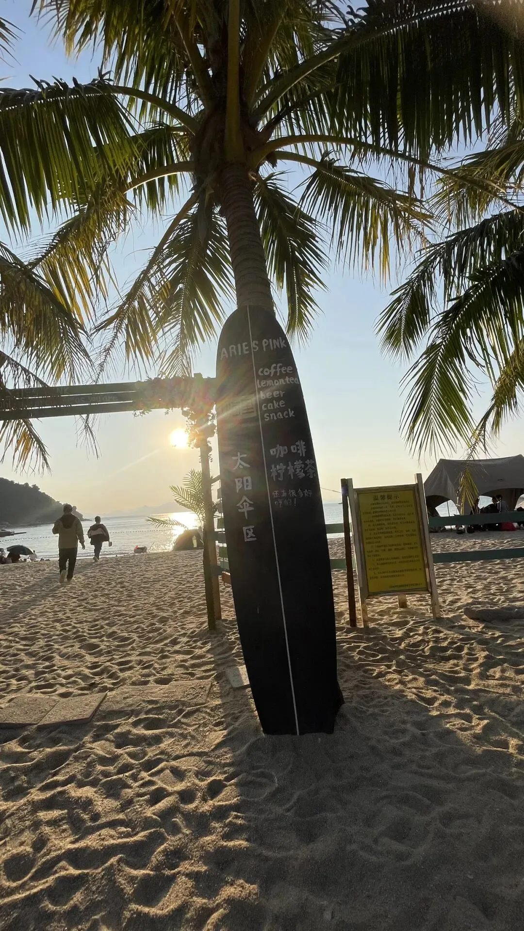 我们沿着沙滩走,看到一家酒店,小卖部,挂着潜水设备的的小店,还看到了一座天后宫的庙宇,再往前走就是一家类似奶茶店,专门为拍照而设计的地方,很文艺,考虑到要消费才入座,我们就路过了。走到这边的风景确实很美,全览整个沙滩。海天一色,手机拍不出实景的美。
