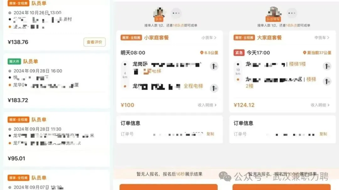 【内容】根据订单具体内容前往订单起点完成搬家装车,跟车到达订单终点完成卸货上楼即可。(订单起步两人完成搬家操作,配合队长做单就好)