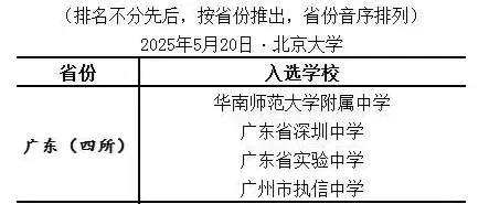 2025 年 5 月,第十一届《中国百强中学》榜单在北京大学正式揭晓。此次广东共有4所中学跻身这份榜单,其中广州占3所、深圳占1所,具体包括华南师范大学附属中学、深圳中学、广东实验中学、广州市执信中学,各校排名不分先后。