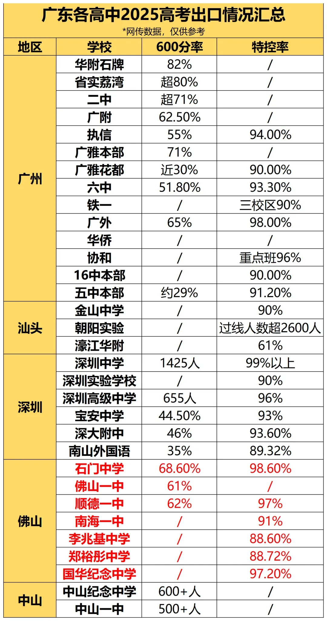 今年广东多所顶尖高中的高考升学表现十分亮眼:深圳中学依旧势头强劲,特控率突破了99%;汕头朝阳实验中学的特控上线人数达到2600人,这一数字在全省位居首位。