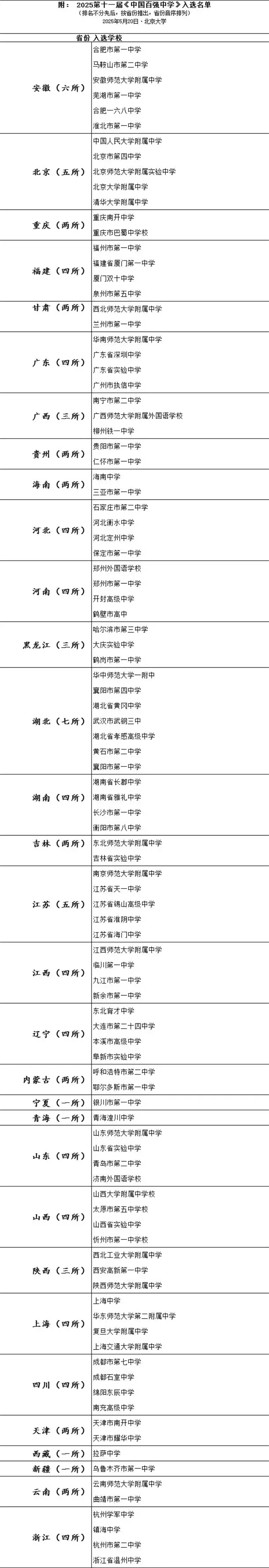 在2025年的《中国百强中学》榜单里,湖北有7所中学入选,是此次上榜数量最多的省份;紧随其后的是安徽,共有6所学校入围;北京、江苏则各有5所中学跻身榜单;广东、福建、河北、河南等省份,均有 4 所中学成功入选。