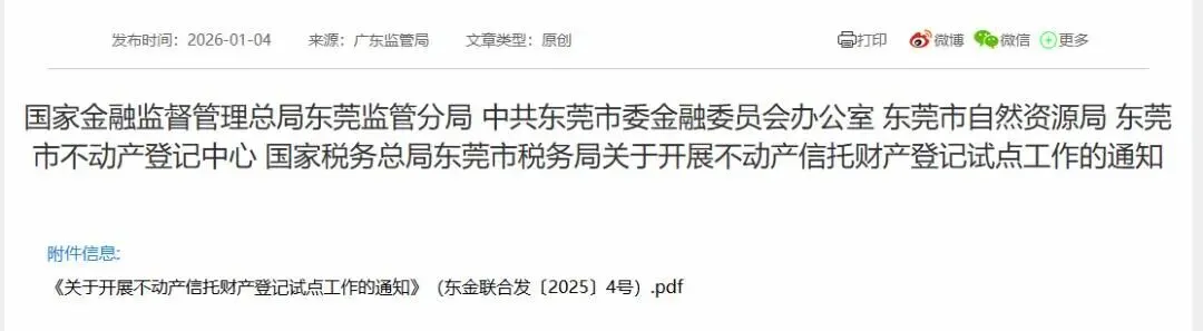 近日,国家金融监督管理总局东莞监管分局、中共东莞市委金融委员会办公室、东莞市自然资源局、东莞市不动产登记中心、国家税务总局东莞市税务局发布《关于开展不动产信托财产登记试点工作的通知》(以下简称《通知》),联合启动不动产信托财产登记试点。