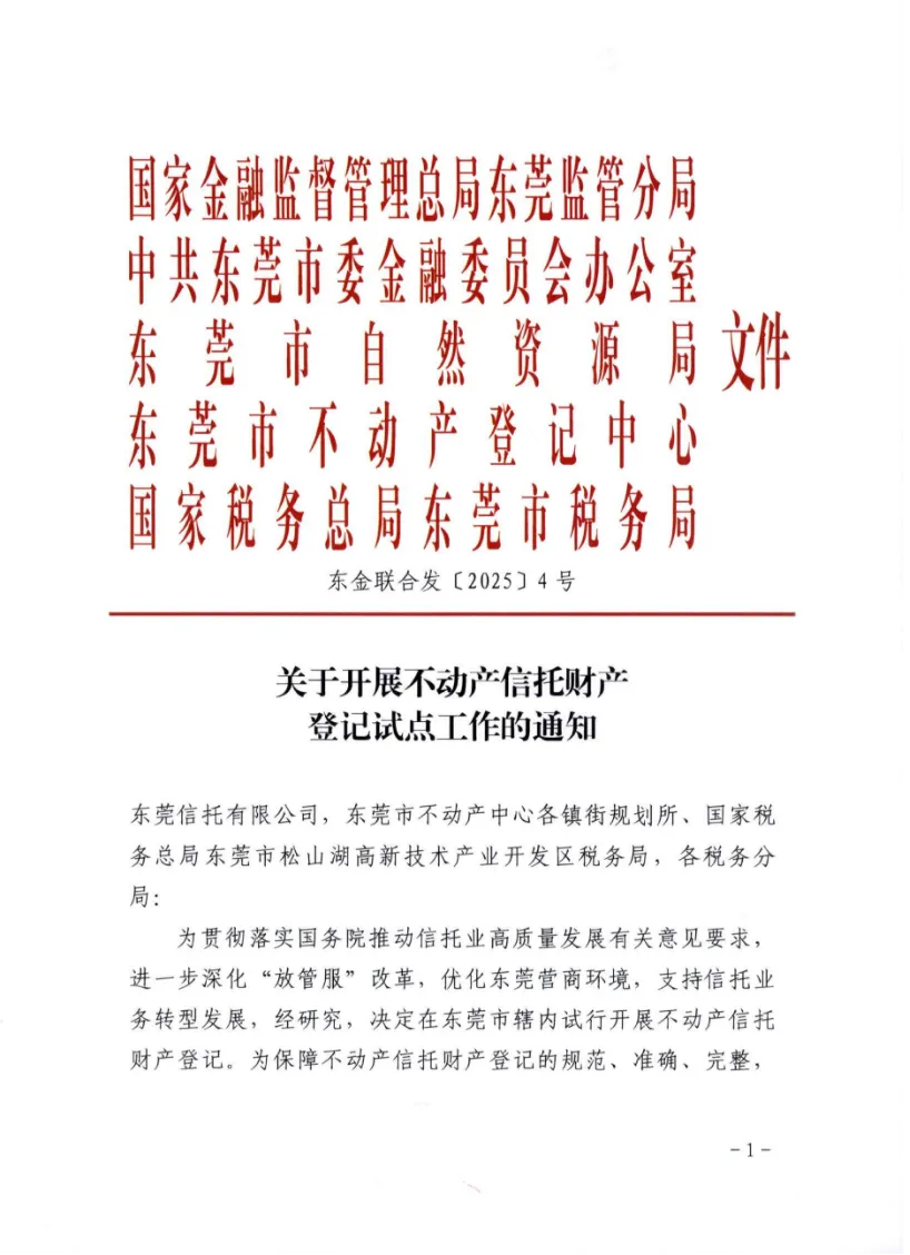 2026年1月4日,国家金融监督管理总局东莞监管分局(简称“东莞金融监管分局”)、中共东莞市委金融委员会办公室、东莞市自然资源局、东莞市不动产登记中心、国家税务总局东莞市税务局五部门联合印发《关于开展不动产信托财产登记试点工作的通知》(简称《通知》),标志着这一创新试点在东莞正式进入实施阶段。