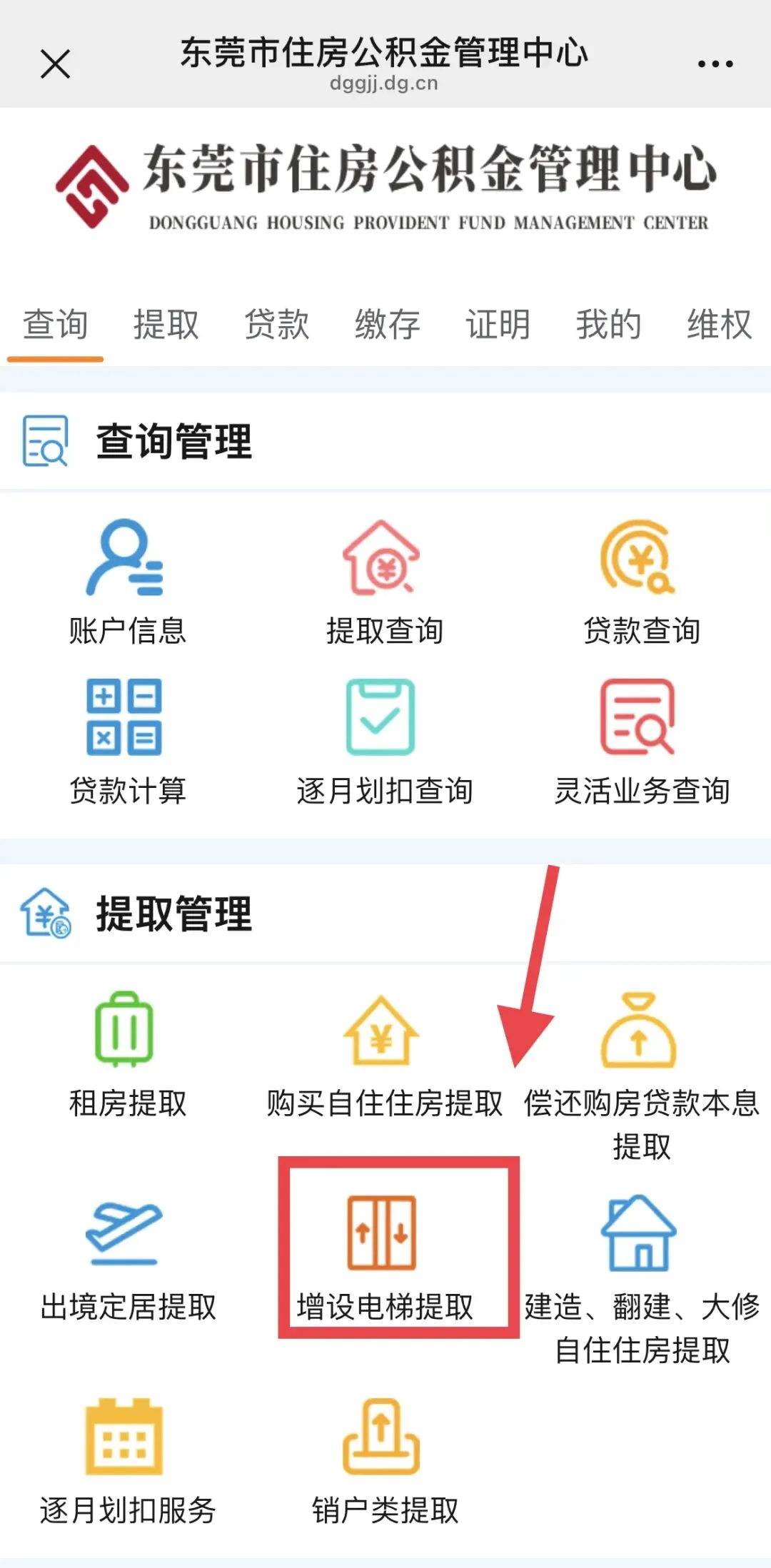第一步:进入东莞市住房公积金管理中心官微,在提取管理选择增设电梯提取,完善相关信息即可开始办理。