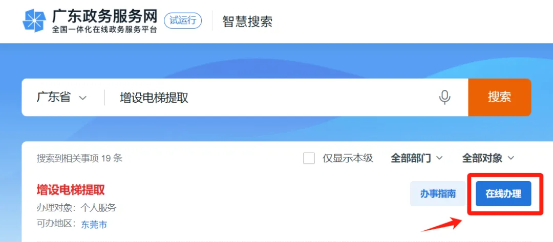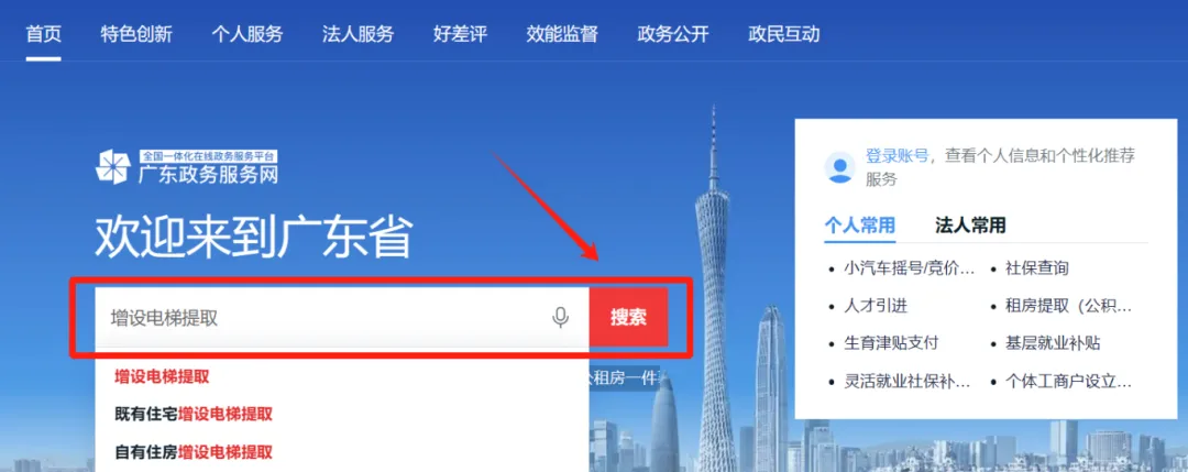 第一步:登录广东政务服务网,在搜索栏搜索增设电梯提取。