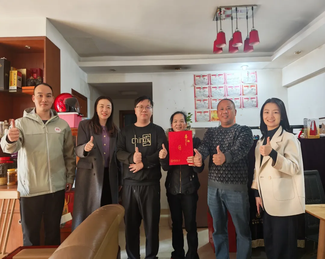 为加强家校联系,传递学院对学生的关怀与肯定,2026年1月4日,外国语学院“送喜报上门”家访活动走进广东省东莞市。学院党委副书记杨宇姣、辅导员梁健晟、陈曼钰、唐露怡一行,先后走访了研究生国家奖学金获得者代表毛峥家庭和本科生奖学金获得者代表骆沛颖家庭,为学生及家长送上获奖喜报并诚挚祝贺。