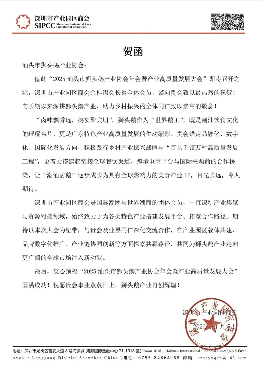 贺函最后,深圳市产业园区商会衷心祝愿大会圆满成功,并祝福汕头市狮头鹅产业协会事业蒸蒸日上、狮头鹅产业再创辉煌。