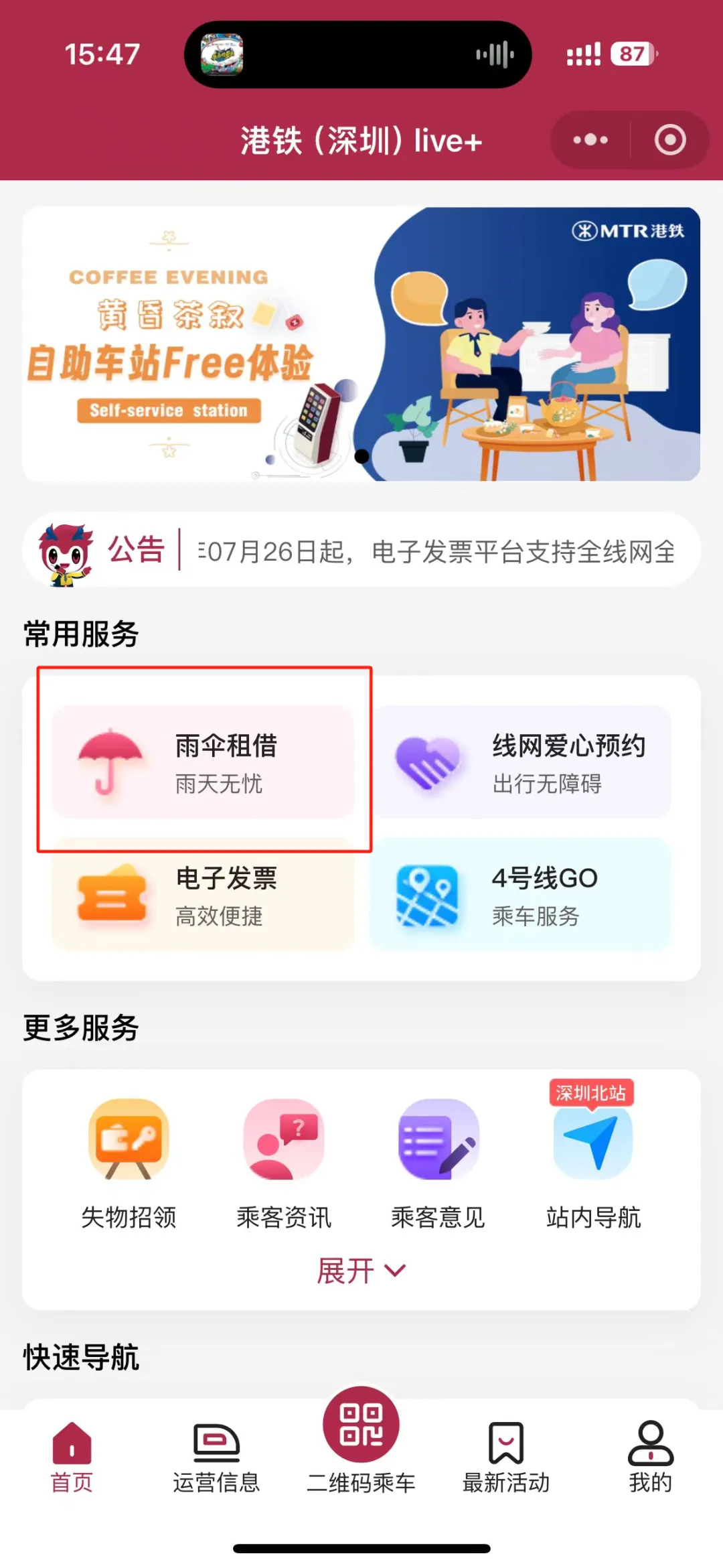 注:港铁4号线可以在【港铁(深圳)live+】微信小程序上使用线上支付的方式缴纳押金来租借雨伞哦!