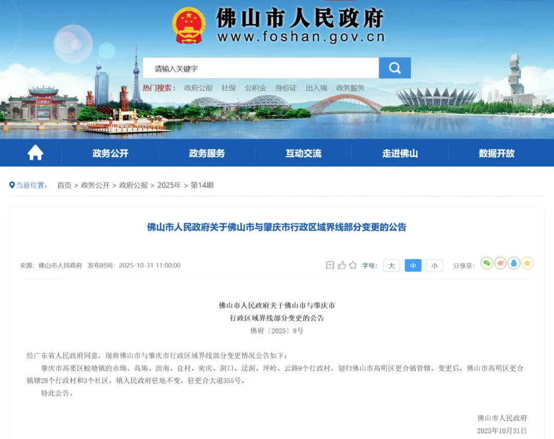 虽然叫广州新机场,但其实场址位于佛山市高明区更合镇和肇庆市高要区蛟塘镇交界处。不过2025年10月31日,佛山市与肇庆市分别印发两市行政区域界线部分变更的公告,明确肇庆市高要区蛟塘镇的赤坳、高㘵、沥南、良村、奕庆、洞口、迳洞、坪岭、云路9个行政村,划归佛山市高明区更合镇管辖。