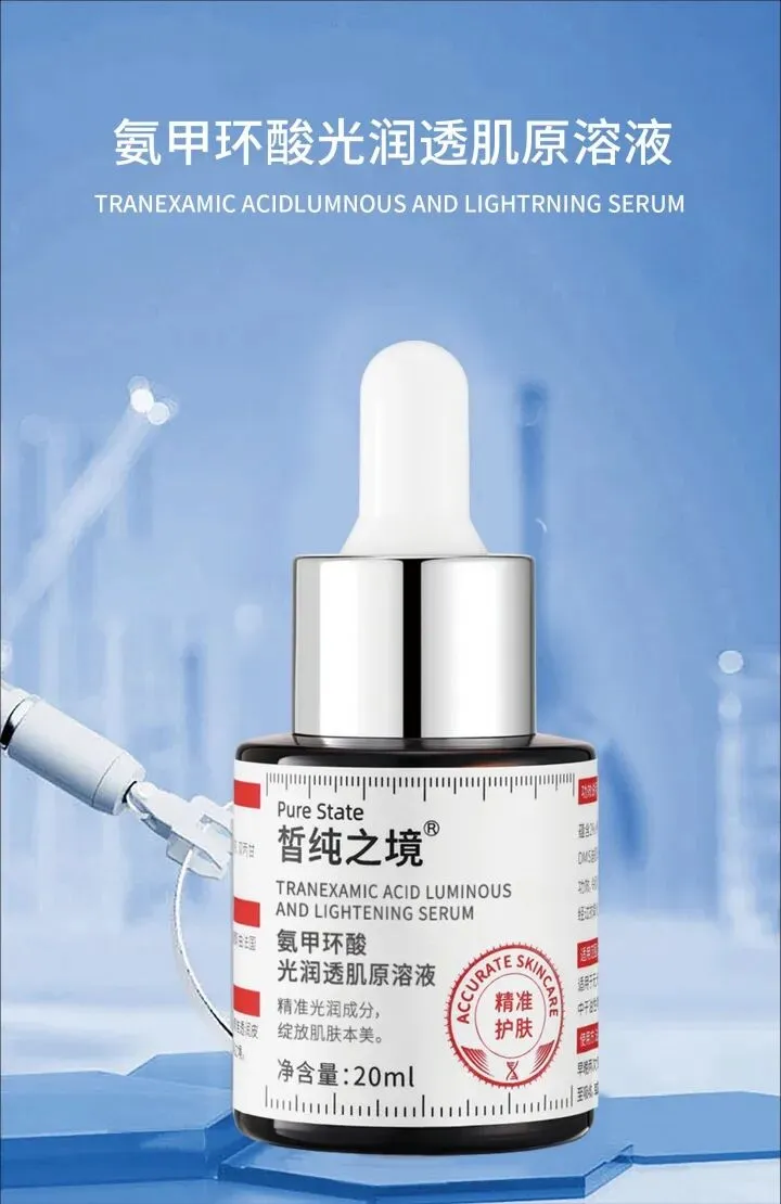 氨甲环酸光润透肌原溶液作为化妆品原料,氨甲环酸(传明酸)常用于美白淡斑类护肤品,其功效基于医学研究中对色素沉着的抑制机制