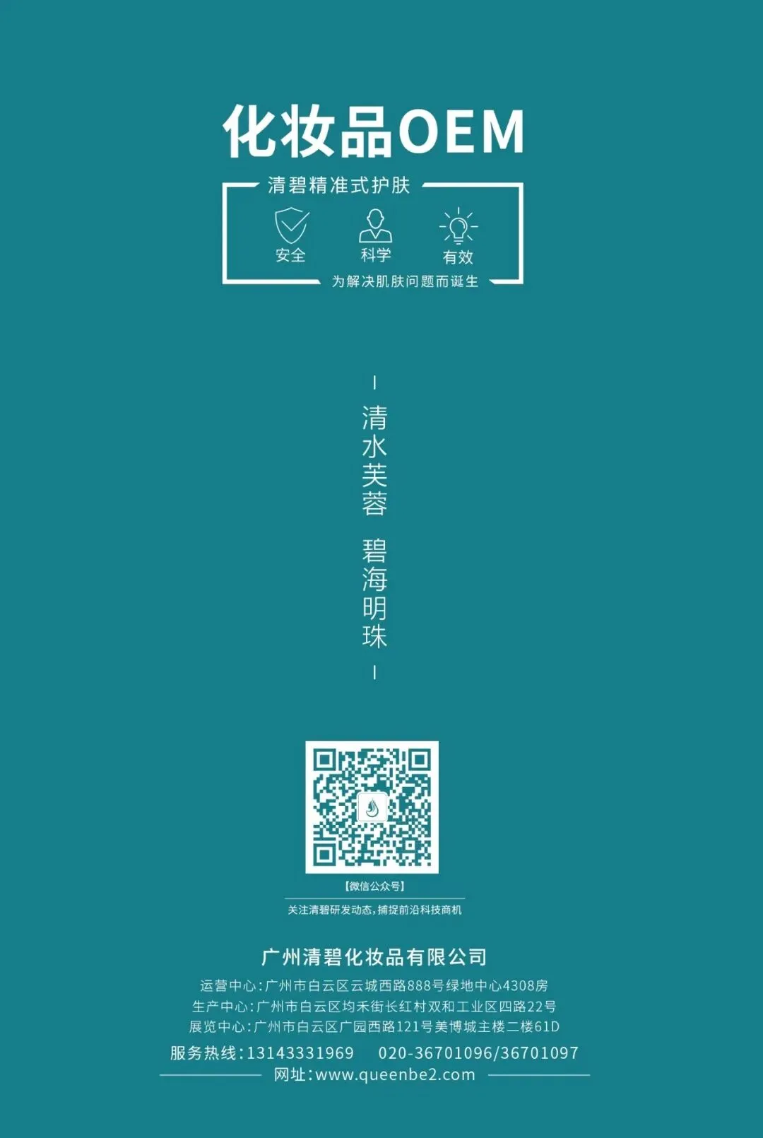 广州清碧化妆品有限公司成立于2003年,注册地位于广州市白云区,法定代表人为揭育科,主要从事化妆品研发、生产及OEM/ODM/OPM加工服务,持有化妆品制造资质及进出口许可,并获得ISO9001、ISO14001、GMPC等国际认证。