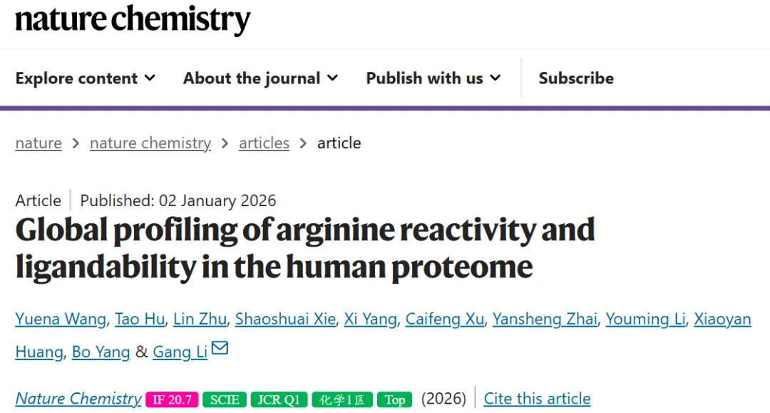 2026年1月2日,深圳湾实验室李刚团队在 Nature Chemistry(IF = 20.7)在线发表题为 “Global profiling of arginine reactivity and ligandability in the human proteome”的研究论文,首次绘制了人类蛋白质组中精氨酸反应性与配体性的全局图谱。