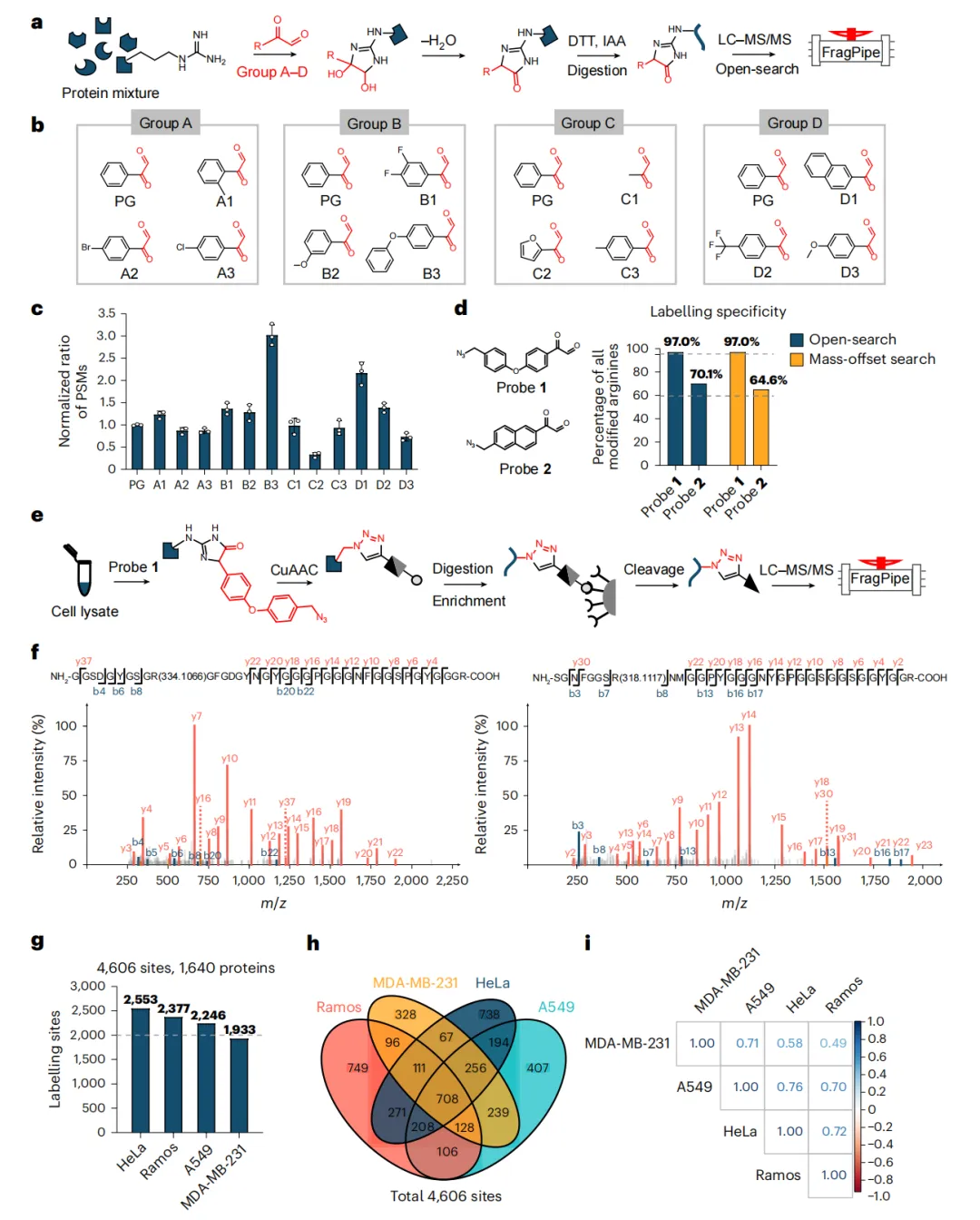图1 | 人源蛋白质组中精氨酸修饰肽段的PG衍生物筛选。a、LC-MS/MS工作流程示意图及探针优化的开放式搜索分析。b、初始筛选中使用的13种PG衍生物结构与分组策略。c、以PG为内标时精氨酸修饰肽段的PSMs标准化数值。数据以三次生物学重复的平均值±标准差表示。d、通过开放式搜索和质量偏移搜索评估探针1和2的选择性,突出精氨酸特异性。水平虚线标记95%和60%特异性水平。e、优化后的化学蛋白质组学工作流程示意图,其中探针1富集前进行胰蛋白酶消化。f、探针1标记的精氨酸位点代表性MS/MS谱图,显示+334 Da或+318 Da质量偏移的共价修饰。g、探针1在多种人源细胞系中鉴定的精氨酸位点总数。h、不同细胞系间鉴定精氨酸位点的重叠情况。i、基于细胞系间精氨酸位点定量的Pearson相关系数热图。