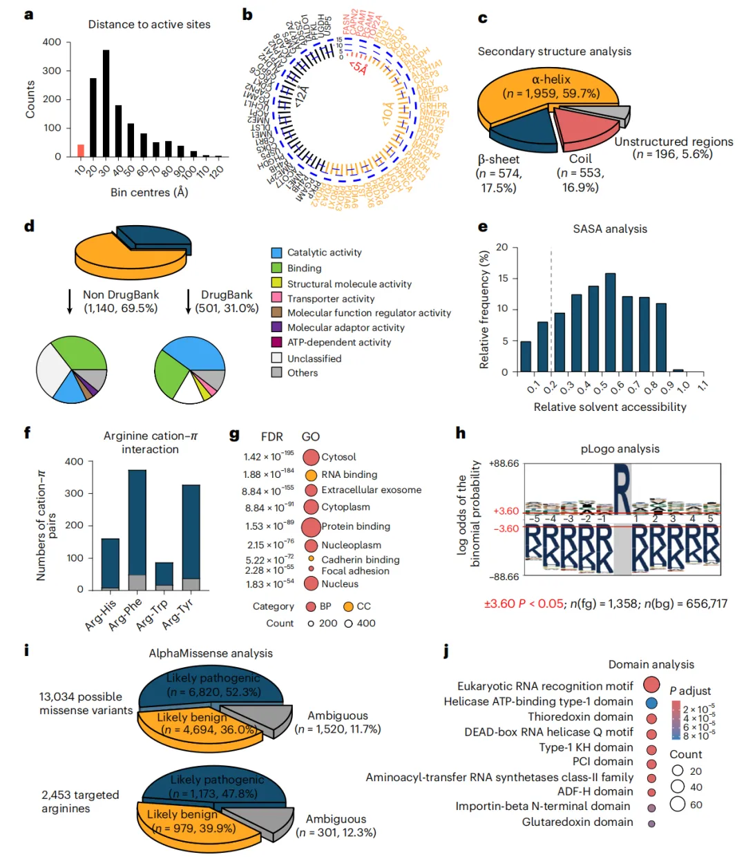 图2 | 标记精氨酸功能的生物信息学分析。a、直方图显示标记精氨酸与活性位点残基之间的距离分布。b、圆形柱状图分类显示位于活性位点5 A、10 A和12 A范围内的精氨酸数量。c、预测二级结构中标记精氨酸的比例:螺旋(包括三转角、四转角和五转角螺旋)、 β 片层(包括 β 链和 β 桥)、卷曲(包括 β 转角、弯曲和卷曲)以及非结构区域。d、DrugBank与非DrugBank条目中含标记精氨酸的蛋白质比例,各组按Panther数据库分类显示功能类别分布。e、标记精氨酸的相对溶剂可及表面积(RSA),溶剂暴露以20% RSA阈值定义,垂直虚线标示该阈值。f、基于AlphaFold结构模型预测的阳离子- π 相互作用分布。深蓝色条形表示距离阈值<6埃的相互作用,灰色条形表示同时满足二面角约束(<20°)的高置信度子集。g,GO分析显示含标记精氨酸的蛋白质主要功能。h,pLogo分析展示标记精氨酸周围的局部序列环境。n(fg),前景集大小;n(bg),背景/参考集大小。i,AlphaMissense预测评估2,453个比对精氨酸中13,034个可能错义变异的致病潜力。j,通过将标记精氨酸映射至prosite注释鉴定的富集蛋白质结构域。显著性通过双侧二项检验(经Benjamini-Hochberg校正,Q < 0.01)确定。