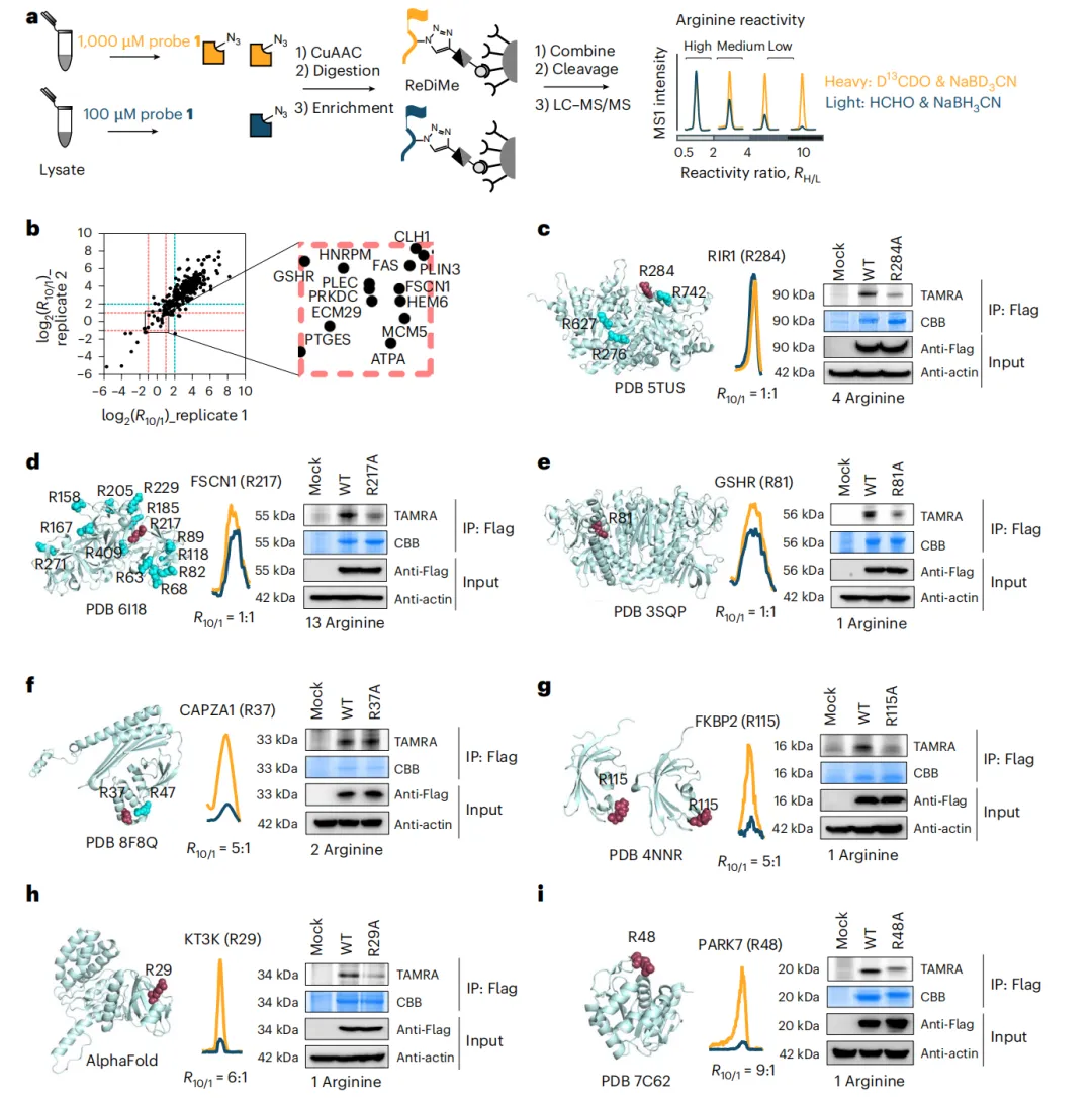 图3 | 人类蛋白质组中精氨酸反应性的定量分析。a,精氨酸反应性分析工作流程示意图。HeLa细胞蛋白质组经100 μM 或1 mM探针1处理后,采用ReDiMe定量蛋白质组学方法进行定量分析。b,显示两个生物学重复中log2(R10:1)值的相关性图。精氨酸位点根据其反应性分类:高反应性(−1 < log2(R10:1)< 1)、中等反应性(1 < log2(R10:1)< 2)和低反应性(log2(R10:1)> 2)。c–i,通过凝胶内荧光验证探针1在特定精氨酸位点的标记。在HEK293T蛋白质组中过表达重组野生型蛋白及其相应的精氨酸-丙氨酸突变体,并用探针1处理。在c–i中,分析的蛋白包括核糖核苷二磷酸还原酶大亚基(RIR1),含有高反应性R284(c);fascin(FSCN1),含有高反应性R217(d);谷胱甘肽还原酶(GSHR),含有高反应性R81(e);封端蛋白肌动蛋白丝Z线亚基α1(CAPZA1),含有低反应性R37(f);肽基脯氨酰顺反异构酶(FKBP2),含有单个低反应性精氨酸R115(g);酮胺-3-激酶(KT3K),含有单个低反应性R29(h);帕金森病蛋白7(PARK7),含有单个低反应性R48(i)。