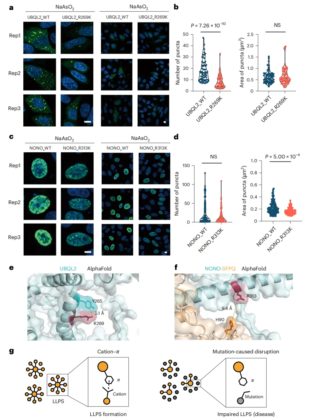 图4 | 阿尔吉宁- π 相互作用介导的相分离。a,c,荧光成像比较野生型与突变型细胞,证实R269在UBQL2相分离中的功能作用(a)及R313在 NONO 相分离中的功能作用(c),采用抗Flag 488荧光标记。比例尺:5 μm 。n = 3个生物学独立重复实验。NS,无统计学意义。b,d,亚砷酸盐处理后野生型与R269K UBQL2细胞(b)及相同条件下野生型与R313K NONO 细胞(d)中斑点数量与大小的定量分析。中心线表示中位数,箱线限表示第25和第75百分位数。采用非配对双尾Student t检验进行统计分析,P值已标注。e,f,AlphaFold2预测结构显示:UBQL2中的R269与Y265形成阳离子- π 相互作用(e); NONO 中的R313在预测的异源二聚体模型 SFPQ 中与H90形成推定的阳离子- π 相互作用(f)。g,精氨酸介导的阳离子- π 相互作用调控 LLPS 的示意图。精氨酸突变破坏这些相互作用并损害相分离。