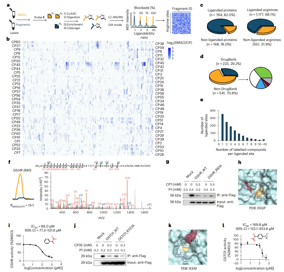 图5 | 人精氨酸位点中乙二醛化合物反应性的全局分布图。f,对应肽段的MS/MS谱图与蛋白质组对照。a,竞争性DIA- ABPP 提取离子色谱图(XICs)工作流程示意图。蓝色轨迹对应用于识别被乙二醛化合物配位的精氨酸。b,热图显示探针1标记的肽段在 GSHR 中与CP1竞争的 GSHR ,黄色轨迹表示未受CP1竞争的配位精氨酸位点的 RDMSO /CP值(DMSO与化合物的比值)。色谱图下方标注了乙二醛化合物库中(RDMSO /CP≥4)的层级聚类平均 RDMSO /CP1值。g,j,对行和列进行验证。细胞裂解液中配位精氨酸的欧氏距离用于分析。Western blot分析证实了选择性聚集的可配体精氨酸位点(柱状图)和乙二醛化合物(行)对HEK293T细胞裂解液中探针1标记的抑制作用,这些细胞表达野生型或根据(1 - Pearson相关系数)聚集以捕获 GSHR (g)和GSTO1(j)的精氨酸-丙氨酸突变体版本。h,k,反应性谱相似性的结构。c,配体化蛋白质的比例(左)展示了 GSHR(PDB 3SQP;h)和GSTO1(PDB 1EEM;k),配体化和精氨酸(右)相对于定量蛋白质的总数,红色高亮显示活性位点,黄色显示酶底物或精氨酸。d,配体化蛋白质的分布分类为DrugBank和配体(紫色)。i,l,半抑制浓度曲线显示CP非DrugBank条目对酶活性的抑制。 GSHR (i)的功能类别分布由Panther 1分类,GSTO1(l)由CP 35分类。