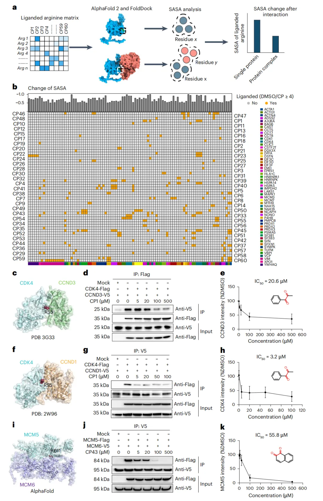 图6 | 酪氨酸靶向配体对蛋白质相互作用的干扰作用。a、示意图展示配体可结合的精氨酸在蛋白质复合物形成时表面积(SASA)的变化。b、潜在介导蛋白质相互作用的配体可结合精氨酸热图。这些精氨酸在二元复合物形成时SASA降低≥50%。c,f,i、选定蛋白质复合物中位于蛋白质相互作用界面的配体可结合精氨酸结构验证:CDK4–CCND3复合物(PDB 3G33)(c)、CDK4–CCND1复合物(PDB 2W96)(f)和MCM5–MCM6复合物(AlphaFold)(i)。d,g,j、不同浓度共价配体对蛋白质相互作用的破坏:CP1对CDK4–CCND3复合物的共免疫沉淀分析(d)、CP1对CDK4–CCND1复合物的共免疫沉淀分析(g)以及CP43对MCM5–MCM6复合物的共免疫沉淀分析(j)。代表性共免疫沉淀实验显示共价配体对选定蛋白质相互作用的剂量依赖性破坏。