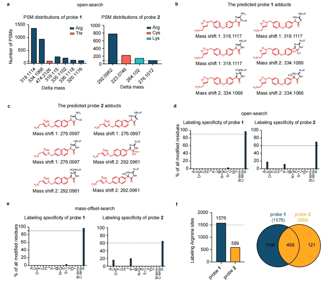补充数据图1 | 探针1与2的特异性分析。a) 探针1和2的肽段修饰分布,考虑局部肽谱匹配(PSMs)超过80的情况。b) 探针1衍生加合物的拟议结构,对应质荷比变化值+318.1117 Da及其氧化形式(+334.1066 Da)。c) 探针2衍生加合物的拟议结构,对应质荷比变化值+276.0997 Da及其氧化产物(+292.0961 Da)。d) 采用开放搜索法进行探针选择性分析。e) 通过质荷比偏移搜索(基于(a)中质荷比变化值)确定探针1和2的选择性。f) 通过闭式搜索,利用各探针预期的差异质量识别修饰位点数量。