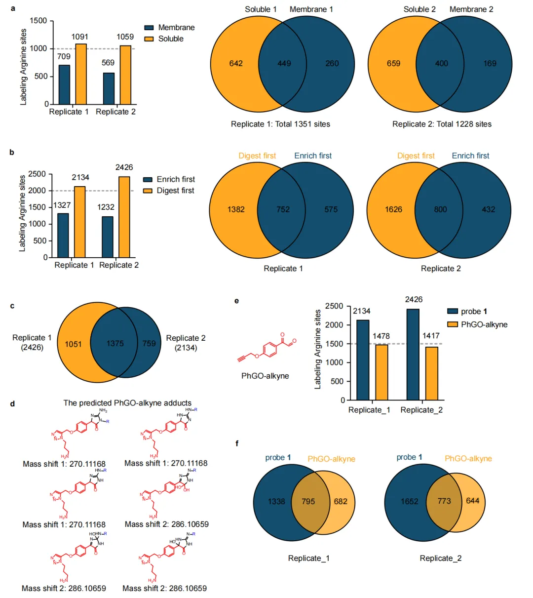 补充数据图2 | 增强精氨酸标记位点的策略。a) 使用探针1在膜组分和可溶性组分中鉴定精氨酸标记位点,包含两个生物学重复。b) 比较采用胰蛋白酶消化先于富集的替代流程与传统富集先于消化的方法,两种生物学重复均已完成。c) 人类蛋白质组中两个生物学重复标记的精氨酸位点重叠情况。d) PhGO-炔烃衍生加合物的拟议化学结构。e) HeLa细胞裂解液中通过探针1和PhGO-炔烃鉴定的精氨酸修饰位点比较。f) 探针1和PhGO-炔烃在人类蛋白质组中标记的精氨酸位点重叠情况。